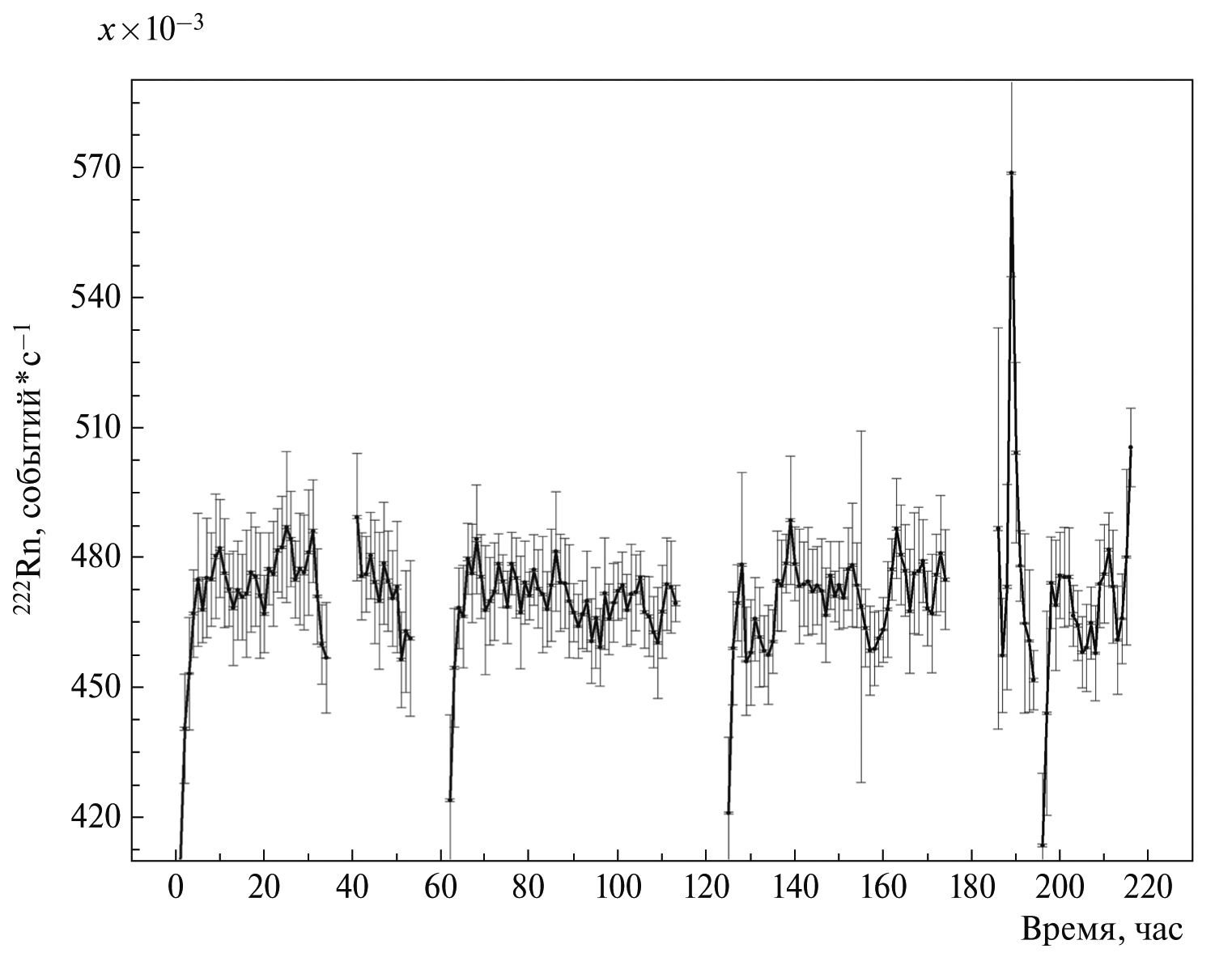 Измерения проводились в период с 24 января по 27 июля 2020 г. График изменения скорости счета представлен на рис. 5. В процессе измерений были обнаружены и решены несколько методических вопросов, влияющих на качество измерений при проведении длительных исследований. Возрастание скорости счета в начале каждой новой серии измерений, начатой после перерыва, связано с установлением равновесия в измерительном объеме. В установившемся режиме на интервале времени 13–33 день площадь радонового гауссиана составляет величину 474 ± 12 имп./1000 с. До начала этих измерений была измерена величина собственного фона замкнутой системы с исключенной контрольной скважиной. Фоновая площадь радонового пика составила величину 34 ± 1 имп./1000 с. Используя приведенные значения, можно рассчитать удельную активность радона в рабочем воздухе камеры (Ау), возникшую за счет выхода радона из стенок скважины: Ау = (474–34) ∙ 0.647 = 285 ± 8 Бк/м3. Для определения скорости выхода радона из стенки скважины следует пересчитать полученную удельную активность на активность рабочего объема контрольной скважины. Предполагаем, что достигнуто равновесие между выходом радона и его распадом. При пересчете учитывалось, что начальный кусок скважины длиной 20 см закрыт уплотнением. Тогда объем Vк.с. = 33.8 л, площадь стенок Sк.с. = 13 587 см2. Полная активность радона, родившегося в скважине, Ак.с. = Ау ∙ (Vк.с. + Vтр. + Vкам.)/1000 = 0.285 ∙ 70.92 = 20.2 ± 0.6 Б, откуда скорость выхода радона из скального грунта s равна s = Ак.с./Sк.с. = 14.9 ± 0.4 с–1 ∙ м–2. При пересчете не учитывалось возможное влияние шероховатостей стенки на величину скорости выхода Rn.