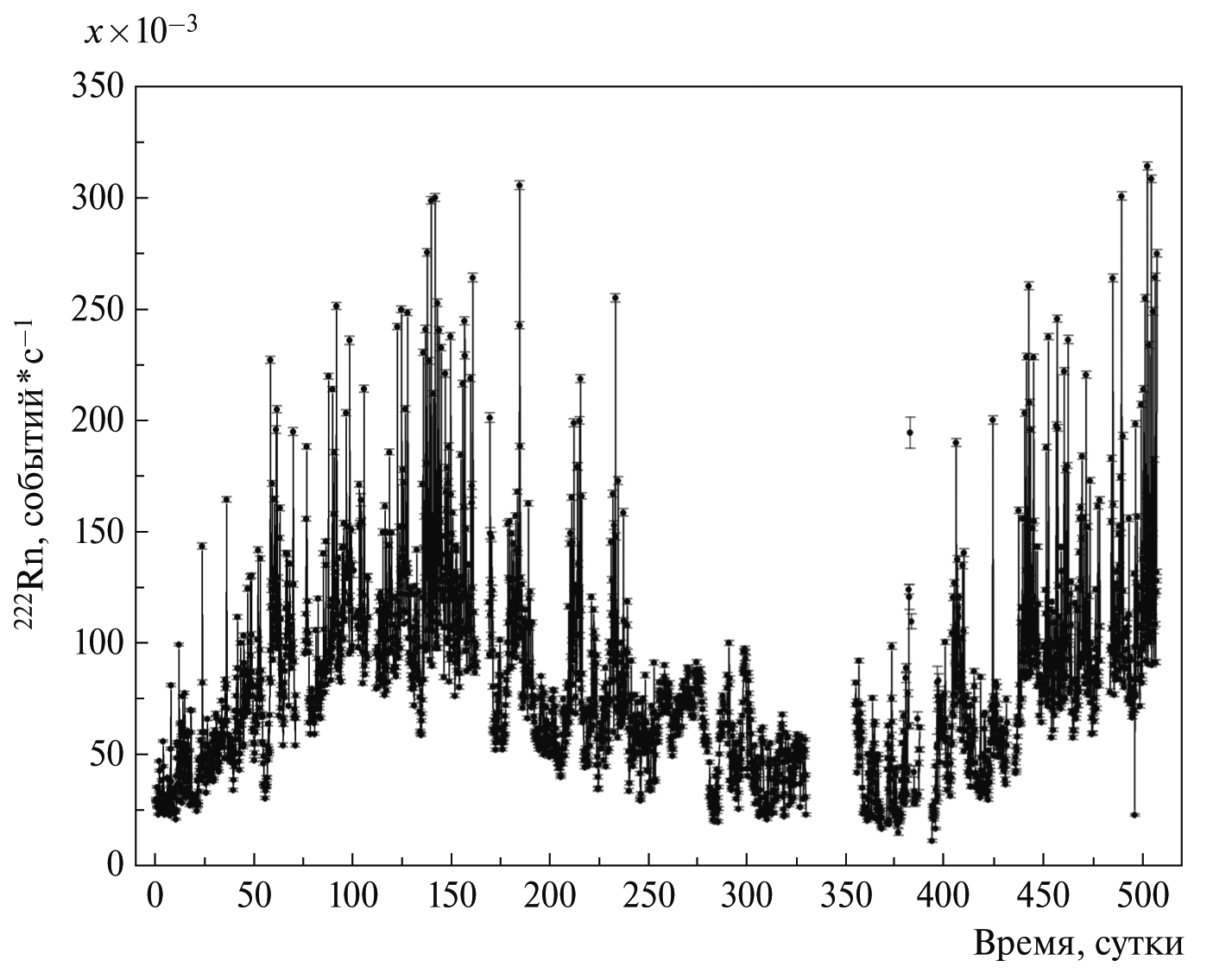 Как видно из рис. 8, содержание радона в проточном подземном воздухе на большом участке штольни практически не отличается от содержания радона в воздухе открытого пространства. Поэтому для наблюдения за сезонными колебаниями содержания радона в наружном воздухе были использованы данные от монитора, расположенного в точке (2). На рис. 10 представлена получившаяся временная зависимость за интервал 16.03.2021 г.–11.07.2022 г. Видно, что к концу июня среднее содержание радона в воздухе поднялось в ∼ 4 раза. Представляет интерес систематизация процессов, приводящих к такому росту. На начальном участке временного интервала на территории Приэльбрусья, где расположена БНО ИЯИ РАН, еще лежит снег. Воздух имеет отрицательную температуру в диапазоне –10...–0 °С. После 26 марта дневные температуры смещаются в область положительных значений. К началу мая склоны окружающих гор до высоты ∼ 2500 м уже свободны от снега. В окружающем мире оживают деревья, происходит рост травы. Этот процесс сопровождается усилением переноса воды в виде растительных соков из почвы в надземную часть растений. Если в этой воде содержится радон, он будет выходить в воздух через большую поверхность лиственного покрова. Для проверки этого предположения на ППД было проведено измерение содержания дочернего 214Bi в березовом соке. Результат представлен в таблице, проба 8. Видно, что содержание радона в этом образце незначительное. В летний период многократно увеличивается сток реки Баксан. Если в речной воде присутствует радон, он будет выходить в воздух в процессе интенсивного перемешивания потока. Образец речной воды был также измерен на ППД. Результат представлен в таблице, проба 9. Кроме реки в окрестностях БНО ИЯИ РАН имеются ручьи и родники. Результаты измерения содержания радона в некоторых из них также представлены в таблице. Видно, что наибольшее содержание радона присутствует в пробах воды из родников. Вода из поверхностных источников является, в основном, талой водой из ледников, в которых содержание материнских изотопов радона очень мало. Поэтому в талой воде и радона мало. В зимний период вода из родников с большим содержанием радона при попадании в реку с существенно сократившимся сезонным стоком будет вызывать рост содержания радона на некотором отрезке речной воды по сравнению с теплым периодом. По мере удаления от места впадения содержание радона в воде будет снижаться за счет его выхода в воздух и он полностью выйдет из воды на первых сотнях метров в соответствии с (п.1) и (п.2) таблицы.