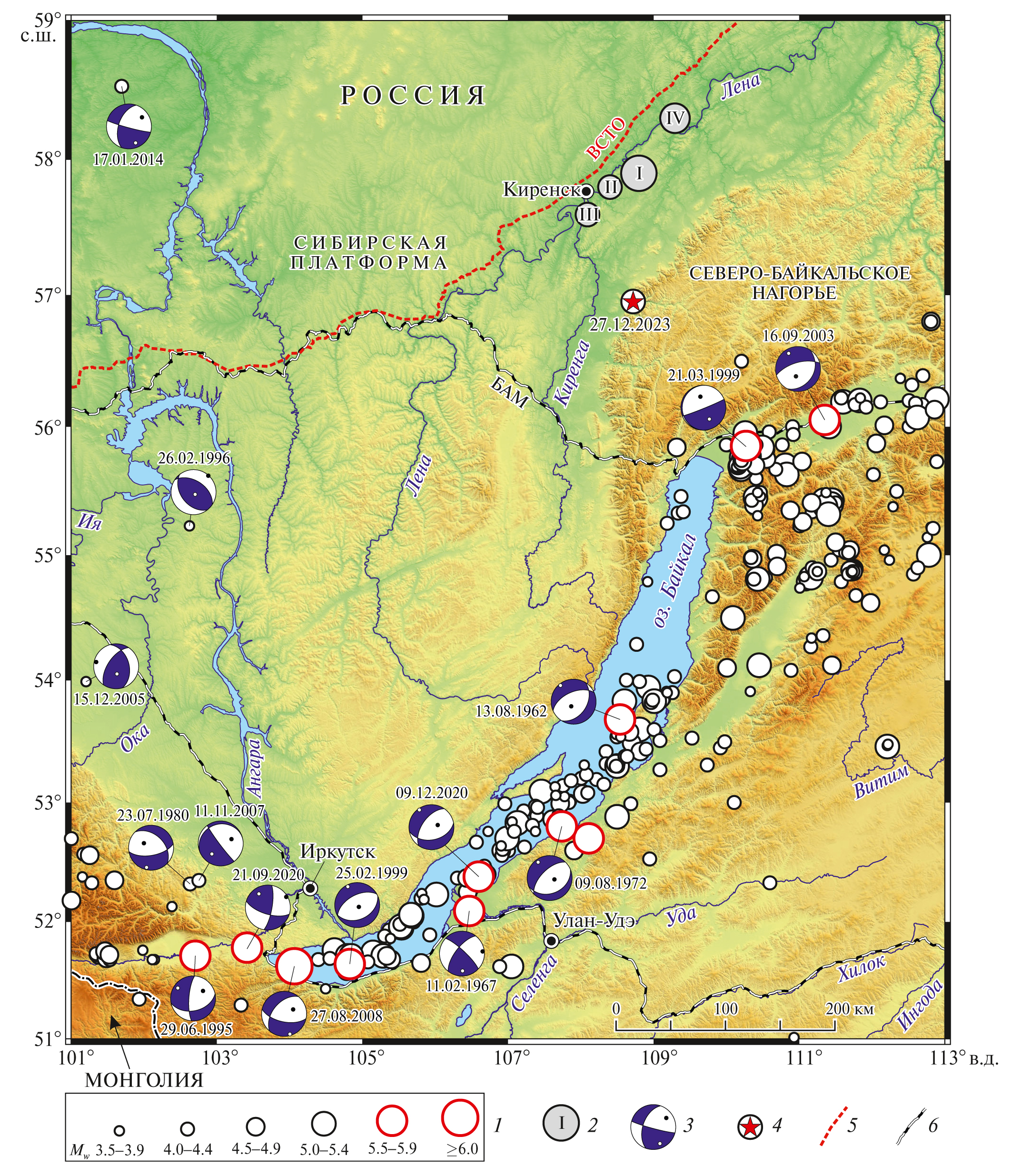 Рис. 1. Сейсмичность южной части Сибирской платформы и сопредельных территорий Байкальской рифтовой зоны: 1 – эпицентры землетрясений с Mw ≥ 3.5 за период инструментальных наблюдений (1960–2023 гг.). В случае отсутствия прямых определений моментные магнитуды Mw рассчитаны из энергетического класса КР с использованием соотношения из работы [Середкина, Гилева, 2016]; 2 – эпицентры исторических землетрясений: I – 05.1827 г. (M = 6.5), II – 11.04.1840 г. (M = 5.0), III – 12.09.1856 г. (M = 5.0) [Новый каталог…, 1977], IV – 24.01.1884 г. (M = 5.5) [Радзиминович, Щетников, 2008]; 3 – стереограммы фокальных механизмов наиболее сильных землетрясений (Mw ≥ 5.5) в проекции нижней полусферы; 4 – эпицентр Акитканского землетрясения 27.12.2023 г.; 5 – трасса трубопровода “Восточная Сибирь–Тихий океан” (ВСТО); 6 – железнодорожные магистрали.