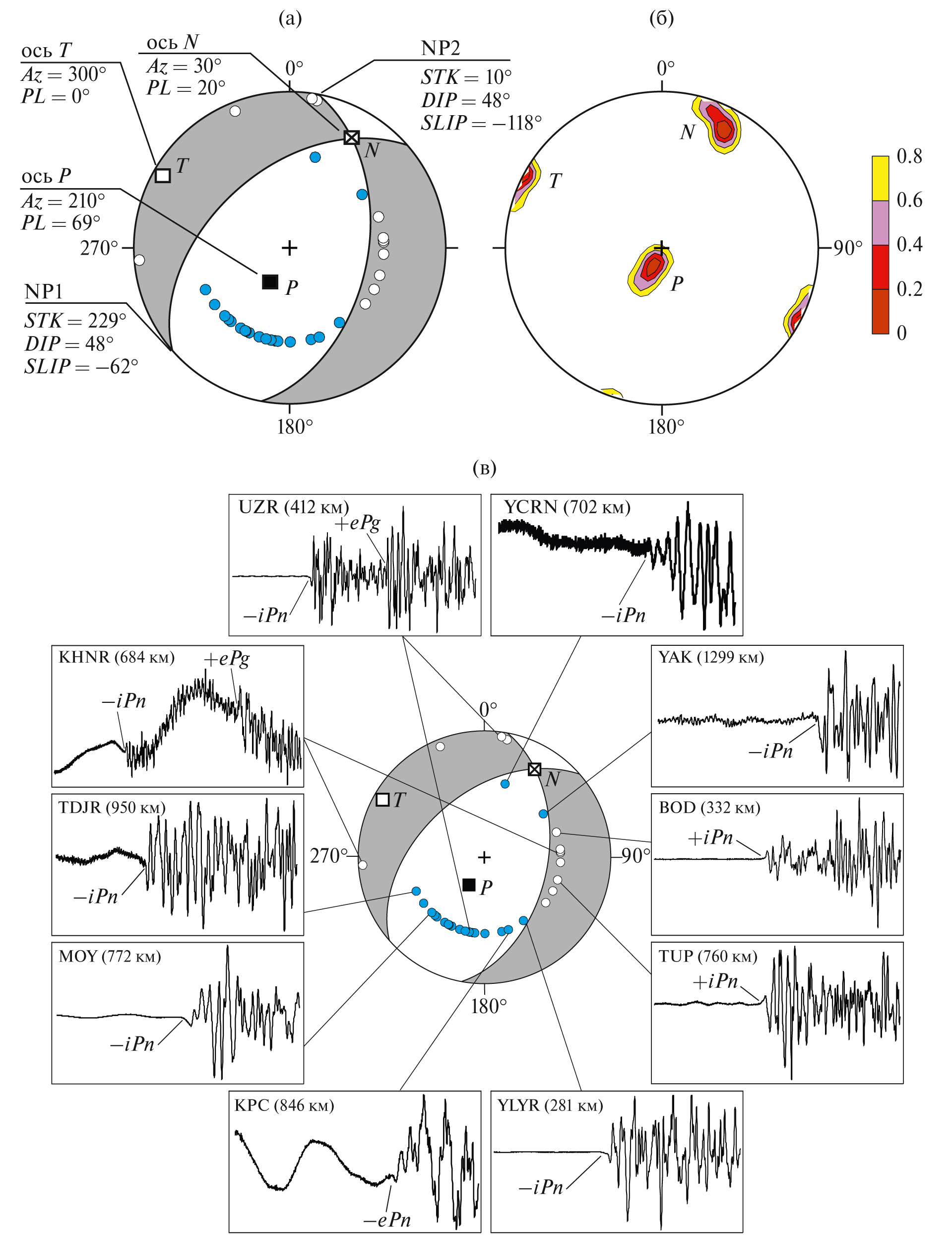 В версии используемого алгоритма, где критерием качества определения механизма очага Акитканского землетрясения является “классическое” правдоподобие [Ландер, 2018], для очаговых параметров оценивались размеры доверительных областей. На рис. 3б показан пример таких областей для главных осей напряжений в очаге (T, N, P). Максимальные отклонения от их оценок в пределах доверительных областей составили 11° (T), 18° (N), 15° (P), что свидетельствует о надежности полученного решения.