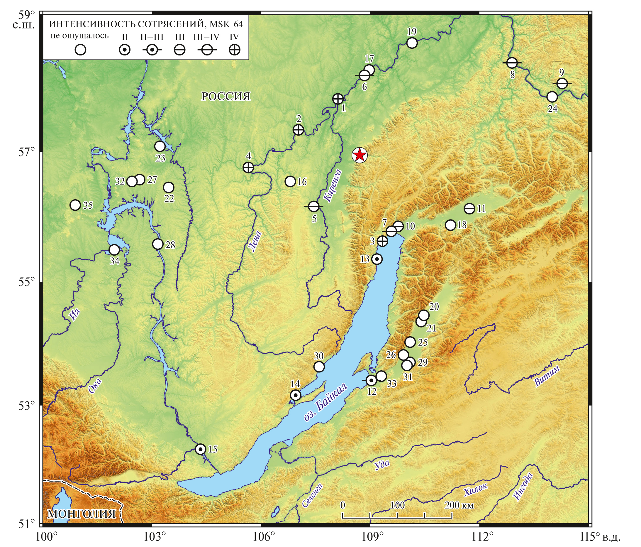Сибирская платформа, в том числе ее граничащая с Байкальской рифтовой зоной периферия, длительное время рассматривалась как тектонически стабильная структура, в пределах которой возникновение сильных землетрясений практически исключалось. Тем не менее при подготовке базового “Нового каталога…” [Новый каталог…, 1977] в краевой части платформы (в долине р. Лены вблизи г. Киренска) было локализовано три исторических землетрясения – 05.1827 г. (M = 6.5 ± 1.0), 11.04.1840 г. (M = 5.0 ± 0.7) и 12.09.1856 г. (M = 5.0 ± 0.7). Впоследствии, с использованием материалов периодической печати Восточной Сибири XIX века, было выявлено еще одно произошедшее в этом же районе землетрясение 24.01.1884 г. (M = 5.5 ± 0.5) [Радзиминович, Щетников, 2008]. Все эти исторические сейсмические события, исходя из местоположения их эпицентров, можно более или менее уверенно связать с зоной Киренско-Джербинского разлома [Карта…, 1982]. Вместе с тем следует принимать во внимание и некоторую долю условности в локализации исторических землетрясений непосредственно в районе г. Киренска, поскольку их параметры были определены по довольно скудным макросейсмическим данным из очень небольшого числа населенных пунктов. Соответственно, локализация эпицентров этих событий характеризуется значительными погрешностями.