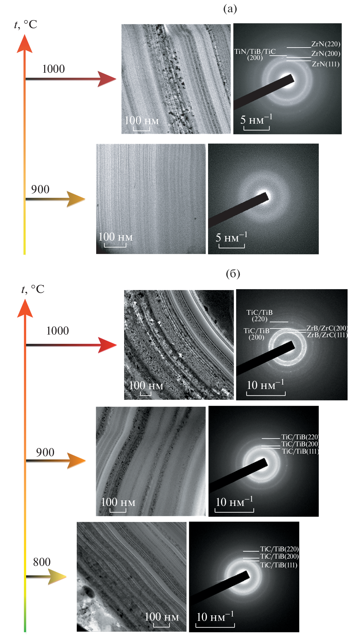 Zr–B–Si–C–Ti and Zr–B–Si–C–Ti–N coatings have been produced for the first time by an arc physical vapor deposition process in a residual argon + nitrogen atmosphere. The Zr–B–Si–C–Ti coating had an amorphous–nanocrystalline structure. Nanocrystallites were formed in the Ti–B–C system, and the amorphous component of the material was formed by Zr–B–C and Si–C phases. The coating of the latter system had a predominantly amorphous structure (amorphous content of ~85–93%) based on titanium nitride with Ti–B and Ti–C bonds, zirconium carboboronitride (Zrx(C,N,B)y), zirconium boride, and silicon carbonitride.