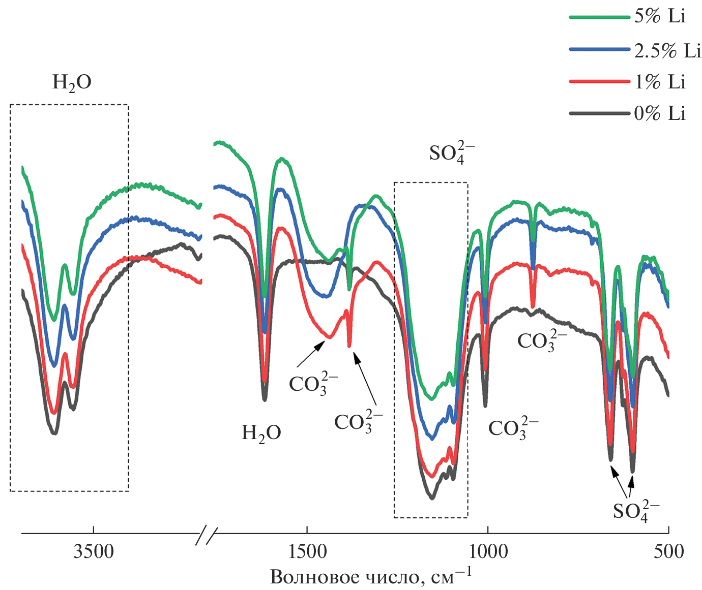 We have studied calcium sulfate (CS) based cement materials containing up to 5 mol % lithium cations. The presence of lithium ions has been shown to increase the solubility of the CS cements in Dulbecco’s solution, which is accompanied by an increase in the pH of extracts from 6.0 to 8.7. Lithium cations were detected in Dulbecco’s phosphate buffered saline during the first 24 h of the experiment, and a calcium phosphate layer was formed on the surface of the lithium-containing CS cements during the seventh day. The presence of lithium ions has been shown to cause a twofold decrease in the temperature of the transition from calcium sulfate dihydrate to the hemihydrate.