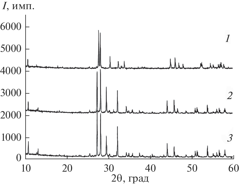 Изучены фазовые отношения в субсолидусной области системы Cs2MoO4–BaMoO4–Gd2(MoO4)3 по разрезам методами рентгенографического и дифференциального термического анализов, проведена триангуляция системы. Синтезирован тройной молибдат CsBaGd(MoO4)3, который кристаллизуется в моноклинной шеелитоподобной структуре (пр.гр. P21/n). Легированием ионами Er3+/Yb3+ CsBaGd(MoO4)3 получен ап-конверсионный люминофор, обладающий антистоксовой люминесценцией в области 400–700 нм при возбуждении ИК-излучением (λвозб = 977 нм). Синтезированный люминофор исследован методами рентгенографии, дифференциального термического анализа и колебательной спектроскопии, изучены его спектрально-люминесцентные характеристики.