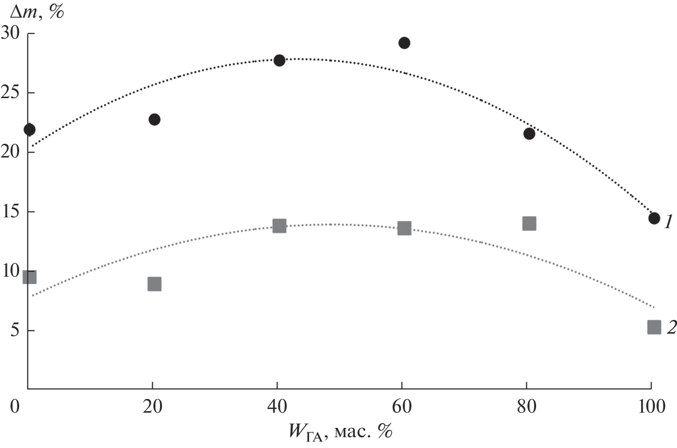 Results of an in vitro study demonstrate that, when brought in contact with tris-buffer, granules based on gelatin and synthetic ceramic powders containing varied percentages of Са10(РО4)6(ОН)2 and β-СаSiO3 rapidly degrade and swell, increasing in size by up to a factor of 1.2. After that, they gradually degrade, releasing calcium ions and phosphate and silicate anions to the solution. The systems with materials containing 20 to 60 wt % calcium silicate have been found to differ little in the concentrations of these ions. The weight loss of the composites, due to dissolution of the mineral components and gelatin, has been shown to exceed that of the apatite and wollastonite granules.