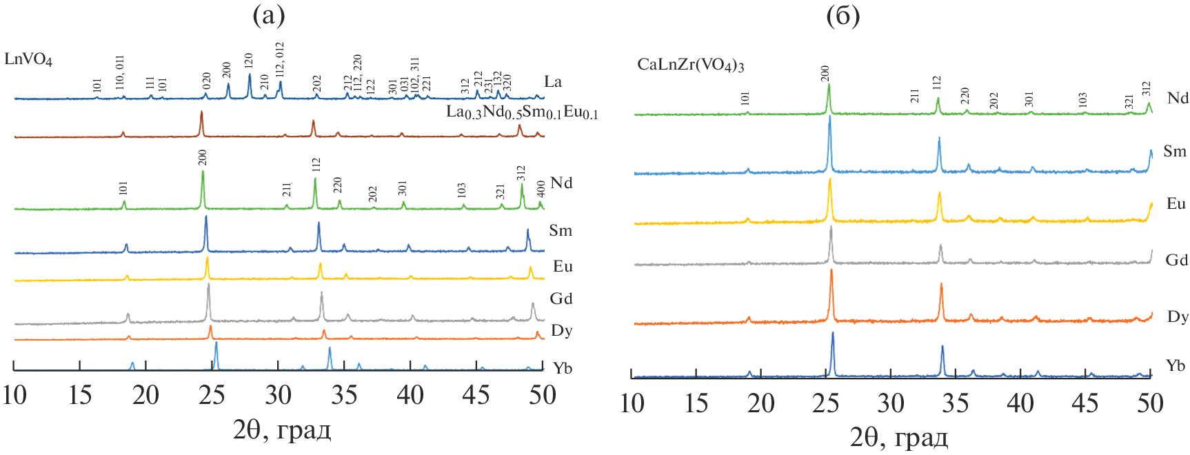 Using coprecipitation, we have synthesized LnVO4 (simple) and CaLnZr(VO4)3 (Ln = Nd, Sm, Eu, Gd, Dy, Yb) (ternary) lanthanide orthovanadates; a La0.3Nd0.5Sm0.1Eu0.1VO4 solid solution, modeling the composition of the lanthanides in radioactive waste (all crystallizing in the zircon structure, sp. gr. I41/amd); and LaVO4, crystallizing in the monazite structure. Their unit-cell parameters have been shown to increase systematically with increasing lanthanide ionic radius. Their mid- and far-IR vibrational spectra suggest that their symmetry is lower than that of classical zircon. The synthesized compounds are stable up to 900°C. Their average thermal expansion coefficients lie in the range (6–11) × 10–6 K–1.