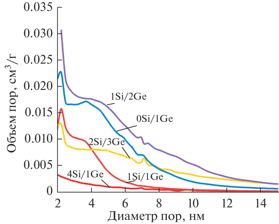 Properties of porous materials prepared from glasses of the Na2O–B2O3–SiO2–GeO2 system have been studied using low-temperature nitrogen adsorption/desorption measurements. The results demonstrate that germanium substitution for silicon in the glasses studied leads to an increase in pore volume at SiO2/GeO2 ratios of down to 0.5. The porous glass with this composition has the largest specific surface area and micro- and mesopore volumes. We assume that the observed changes in the porosity parameters of glass in the case of complete germanium substitution for silicon are related to structural features of the borogermanate glass network, associated with B–O–B bond breaking and the formation of non-bridging oxygen atoms.