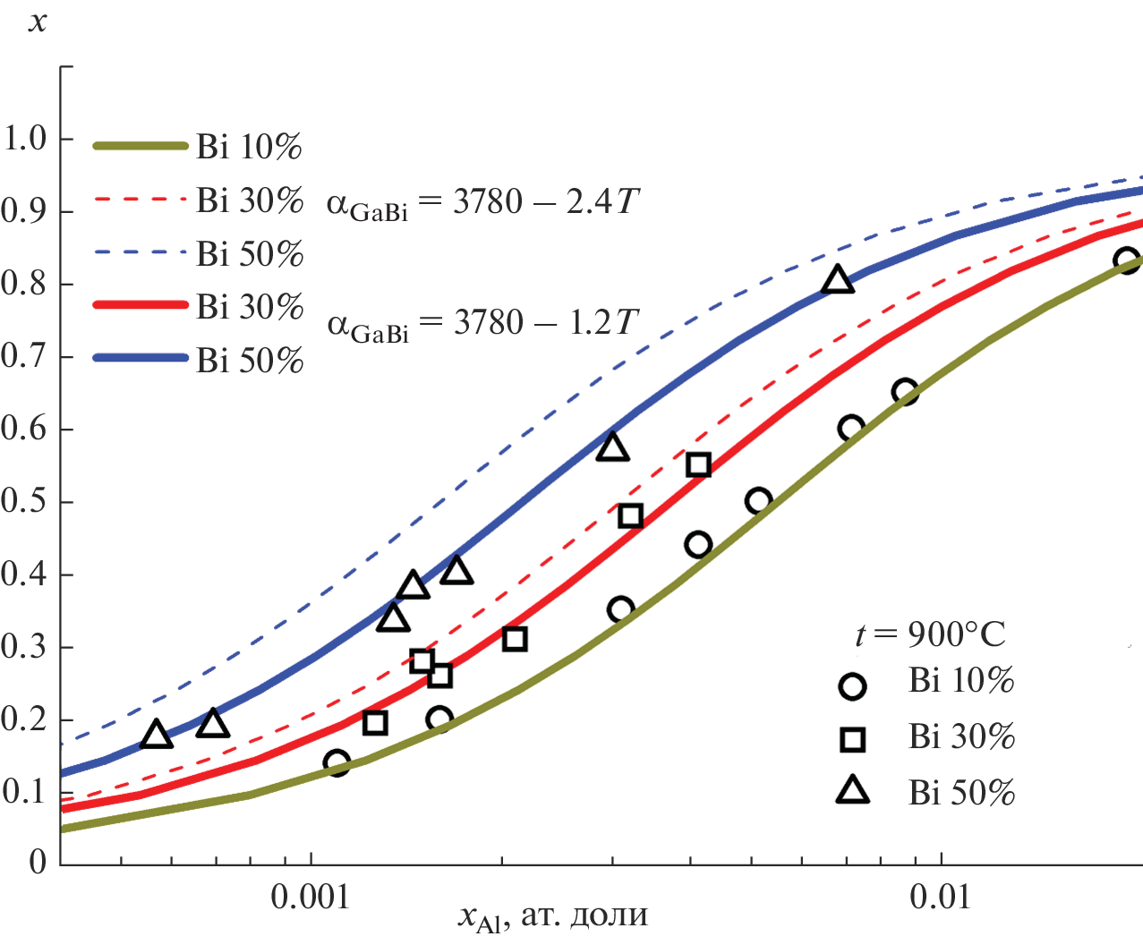 Solidus and liquidus isotherms in the Al–Ga–As–Bi system have been modeled for an initial epitaxy temperature of 900°C, which is needed for growing relatively thick (50–100 μm) compositionally graded AlxGa1–xAs layers. The theoretical isotherms have been confirmed by experimental data. It has been shown that, to grow relatively thick (>50 μm) AlGaAs layers, it is reasonable to use Ga–Bi mixed melts containing no more than 20 at % bismuth.