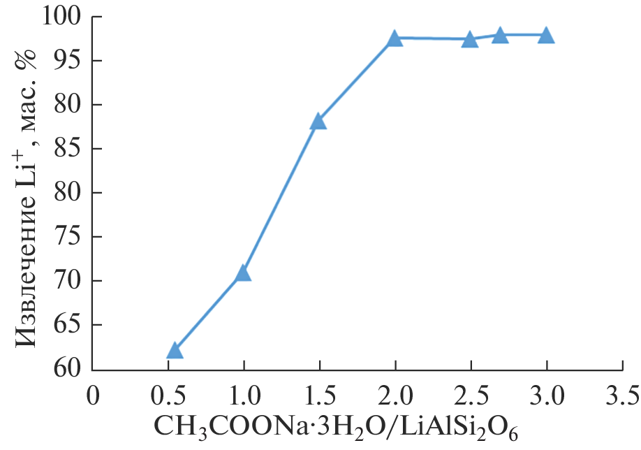 In this paper, we report a process for lithium extraction from spodumene raw materials. We demonstrate that a promising approach for processing spodumene is sintering with sodium acetate. In the reaction between these components, the crystal structure of spodumene remains intact. Ion exchange reaction between CH3СOONa⋅3Н2О and LiAlSi2O6 yields water-soluble sodium acetate and water-insoluble sodium aluminosilicate (NaAlSi2O6). The sodium acetate dissolved in water is converted to lithium carbonate by adding a Na2CO3 solution. The lithium carbonate precipitate is essentially free of foreign impurities. We analyze the effect of process parameters on the degree of Li+ extraction from spodumene.
