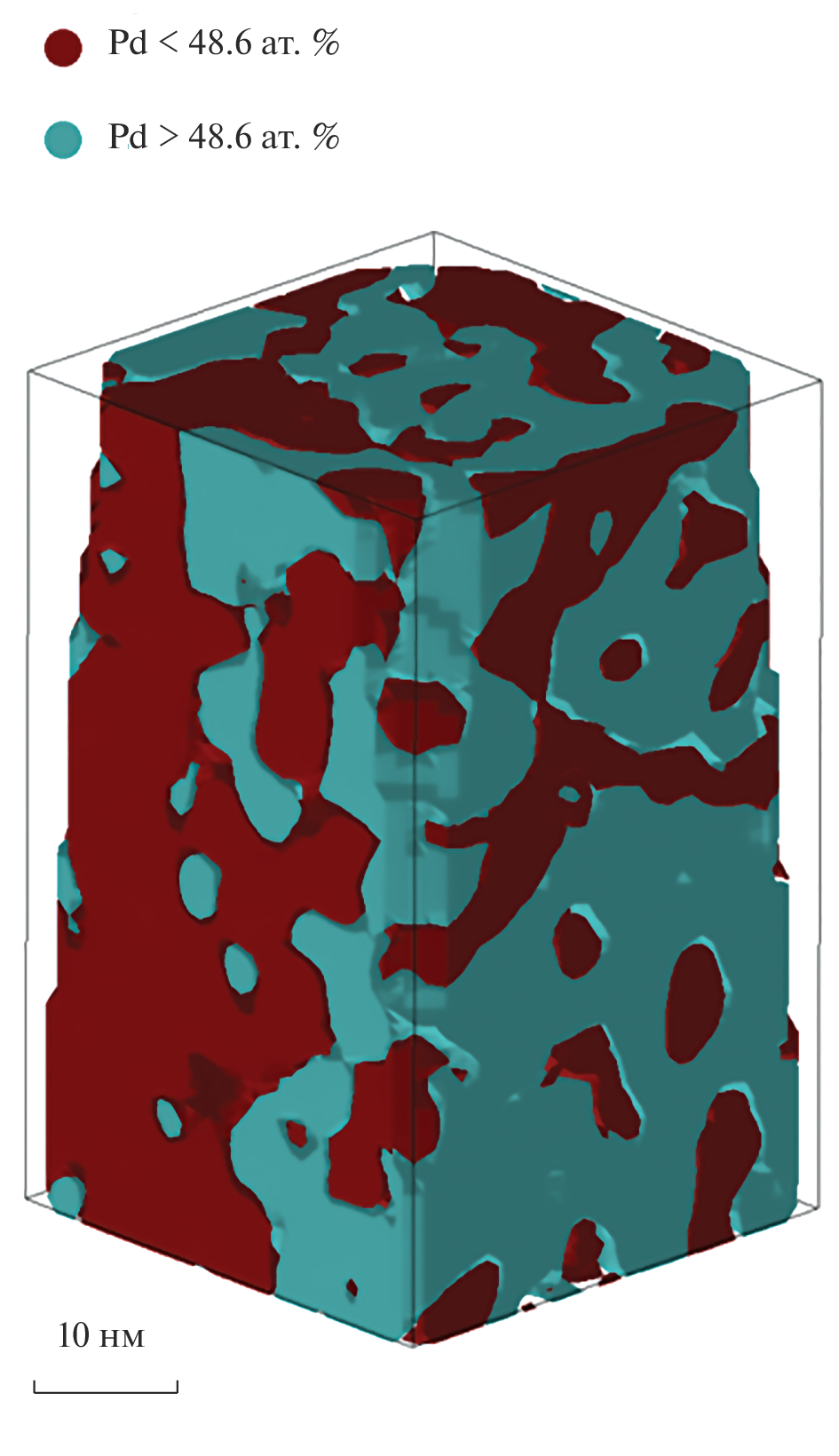 Современными методами высокоразрешающей просвечивающей электронной микроскопии исследованы изменения структуры твердого раствора Cu (51 ат. %)–Pd. Установлен характер концентрационного расслоения неупорядоченного твердого раствора. Результаты могут быть положены в обоснование малой скорости процесса упорядочения при приближении состава к эквиатомному.