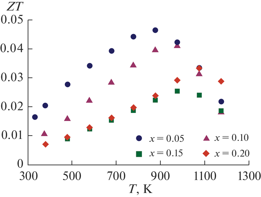 На основе результатов измерений удельной электропроводности (σ), коэффициента Зеебека (S), термического расширения, теплоемкости и температуропроводности на воздухе в температурном диапазоне 300–1200 K определены теплопроводность (κ), фактор мощности (S2σ) и термоэлектрическая добротность (ZT = S2σT/κ) манганитов Ca0.5−xSr0.5LuxMnO3−δ, где x = 0.05, 0.10, 0.15 и 0.20. Установлено, что наибольшие S2σ и ZT имеет состав Ca0.45Sr0.5Lu0.05MnO3−δ, благодаря высоким значениям S и низкой κ.