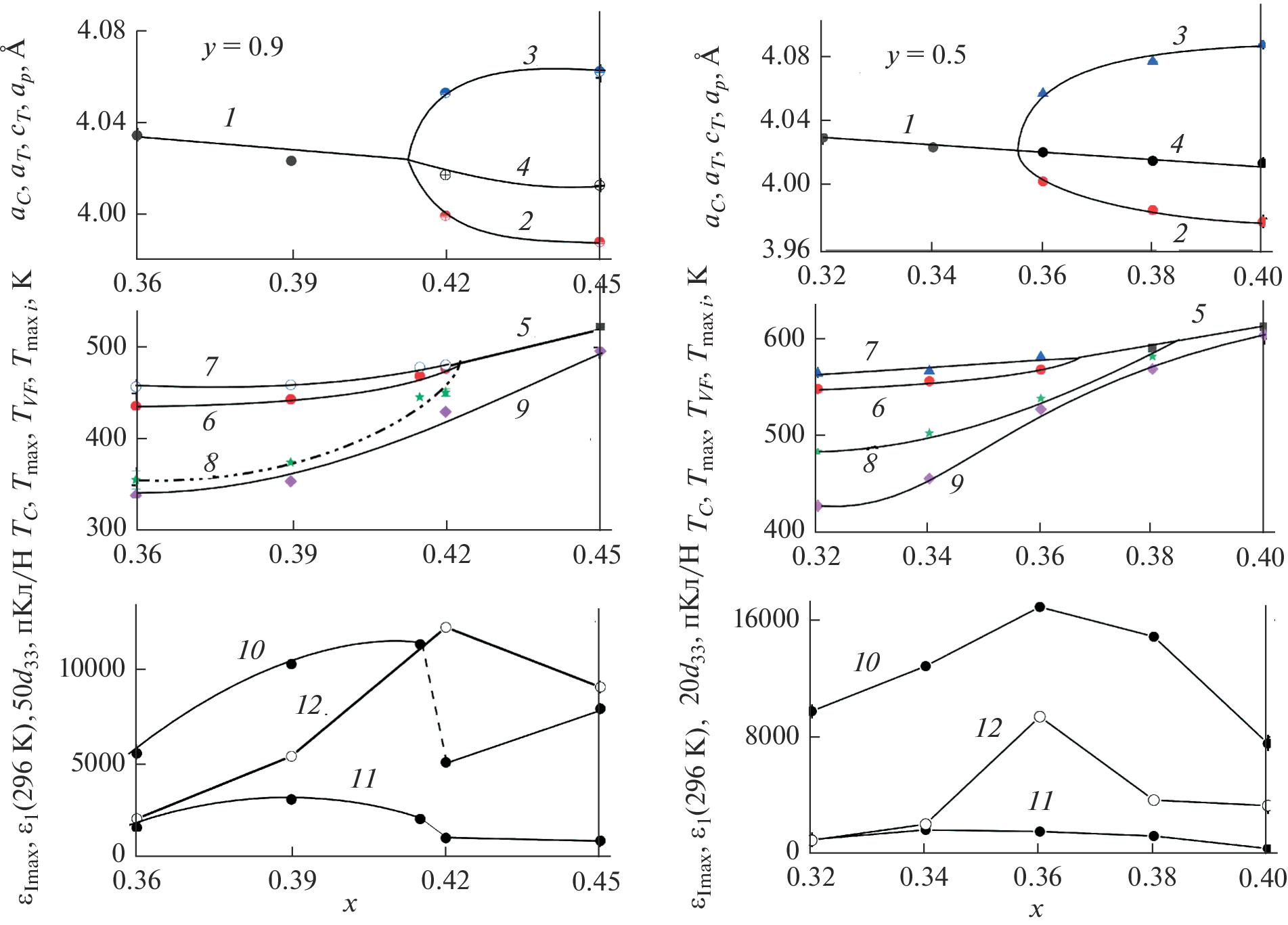 На синтезированных керамических образцах разрезов (1 – 2x)BiScO3·(2 – y)xPbTiO3∙yxPbMg1/3Nb2/3O3 с y = 1.2, 1.0, 0.9 и 0.5 тройной системы BiScO3–PbTiO3–PbMg1/3Nb2/3O3 (BS–PT–PMN) проведены рентгенодифракционные, диэлектрические и пьезоэлектрические исследования, а также изучены токи термостимулированной деполяризации. Установлено, что образцы при (1 – 2x) ≲ 0.5 представляют собой твердые растворы со структурой перовскита, их симметрия с ростом содержания BS повышается от тетрагональной до кубической, в промежуточной области составов (морфотропной области – МО) образцы состоят из смеси твердых растворов разной симметрии. Определены границы МО, получены данные об изменении диэлектрических и пьезоэлектрических свойств твердых растворов с изменением их состава.