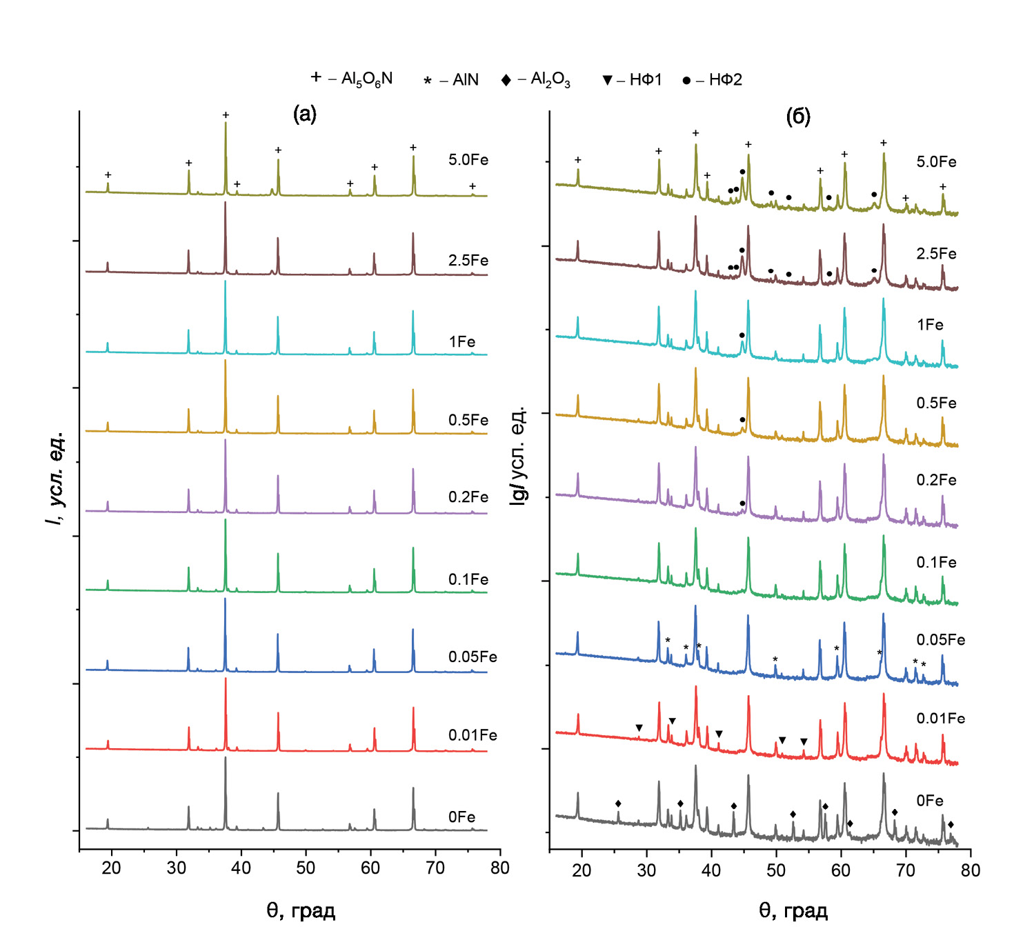Рис. 1. Дифрактограммы образцов в линейном (а) и логарифмическом (б) масштабе AlON:Fe (НФ1 и НФ2 – неидентифицированные фазы)