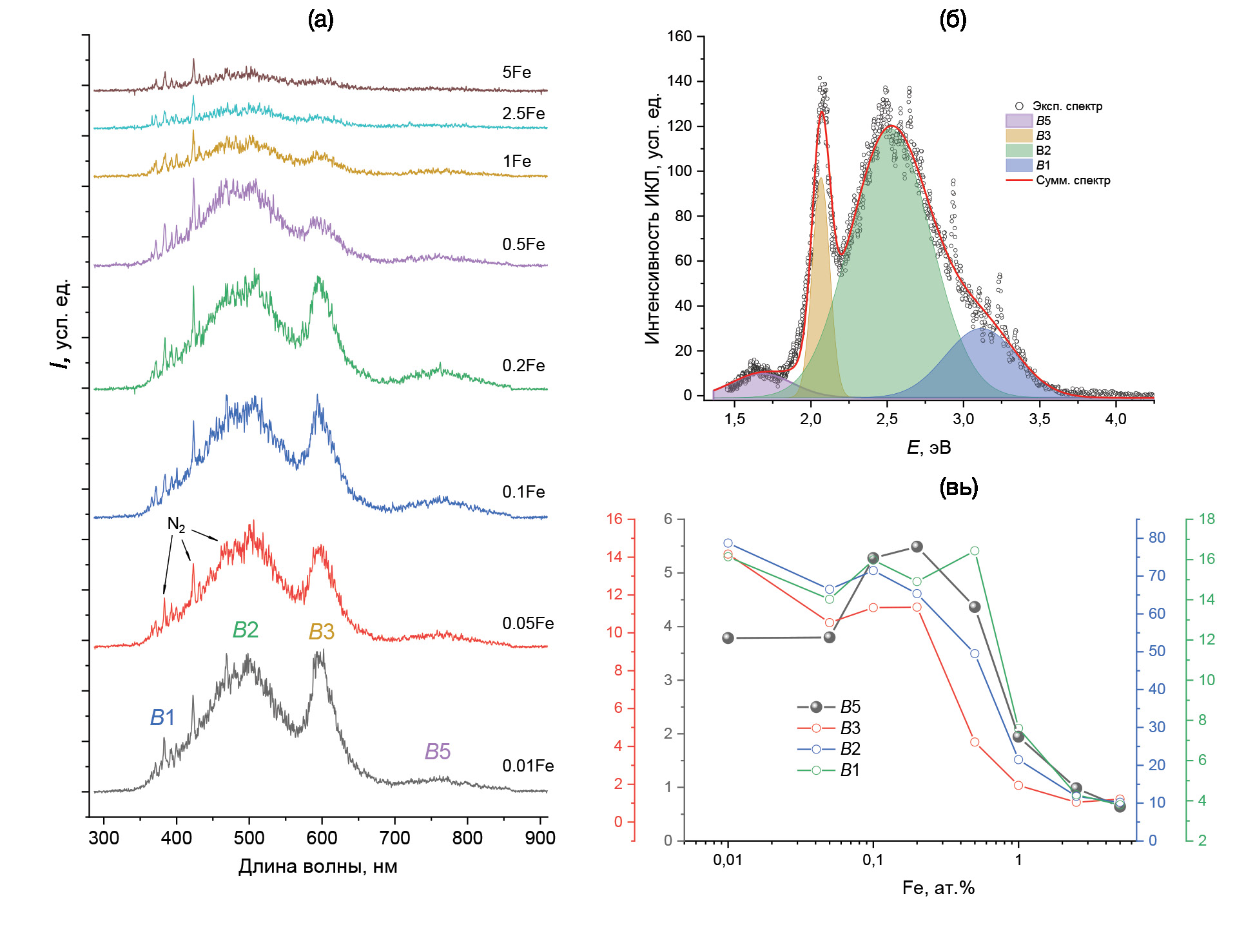 Анализ спектров ИКЛ осуществлен путем аппроксимации экспериментальных данных, которая проводилась одновременно по всем экспериментальным спектрам с единым критерием χ2 функцией, состоящей из четырех гауссовых компонент с одинаковыми положением максимумов и полушириной для всех спектров. Интенсивность каждой компоненты подобрана индивидуально для всех спектров ИКЛ. Результат аппроксимации приведен на рис. 6б на примере образца AlON:0.01Fe. Обозначение полос аналогично тем, что приведены в работах [18, 19]: B1, B2, B3, B4 и B5. В спектрах AlON:Fe обнаружены четыре полосы B1, B2, B3 и B5 с максимумами 3.11 (398), 2.52 (492), 2.06 (602) и 1.68 эВ (738 нм) и полуширинами 0.55, 0.61, 0.14 и 0.38 эВ соответственно. Полосы B1 и B4 относятся к излучательным переходам в AlN [19]. Полоса B4 в спектрах AlON:Fe не зарегистрирована. Являющаяся одной из самых интенсивных полоса B2 в AlON принадлежит к излучению дефектов типа [V‴Al–3O•N]. Полосы B3 и B5 были ранее отнесены к излучению примесных ионов в AlON, таких как Fe, Mn, Ti [18, 19]. Для выяснения природы полос были построены зависимости их интенсивности от концентрации железа (рис. 6в). Интенсивность полосы B5 в отличие от полос B1–B3 достигает максимума при 0.2 ат. % Fe и последовательно снижается в диапазоне концентраций 0.2–5 ат. %. Такое поведение типично для концентрационной зависимости интенсивности примесной люминесценции, что может указывать на вовлеченность ионов железа в процессы переноса заряда, связанные с полосой B5. Резкое снижение интенсивности свечения всех полос люминесценции при концентрации Fe более 0.2–0.5 ат. % (рис. 6в) связано с образованием примесной железосодержащей фазы и ростом оптического поглощения. Полоса B3 может принадлежать к люминесценции ионов Mn, что, однако, требует экспериментальной проверки.