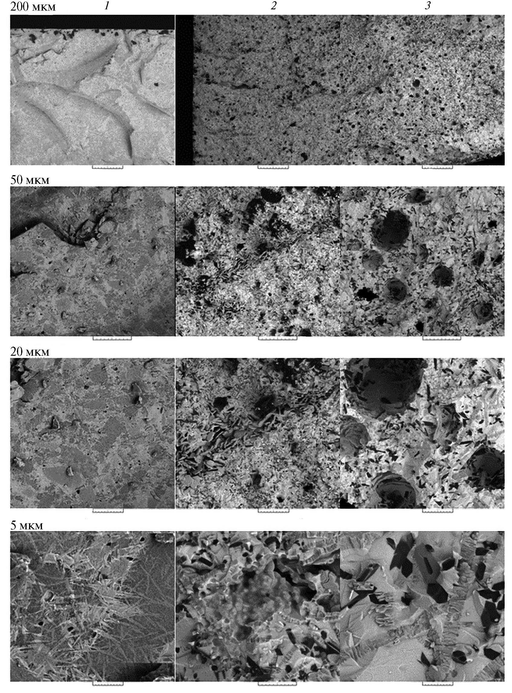 Рис. 7. Микрофотографии образцов стеклокерамики Er:YAG/20Bi2O3–65B2O3–15BaO, полученных при 700 (1), 1100 (2), 1250°С (3)
