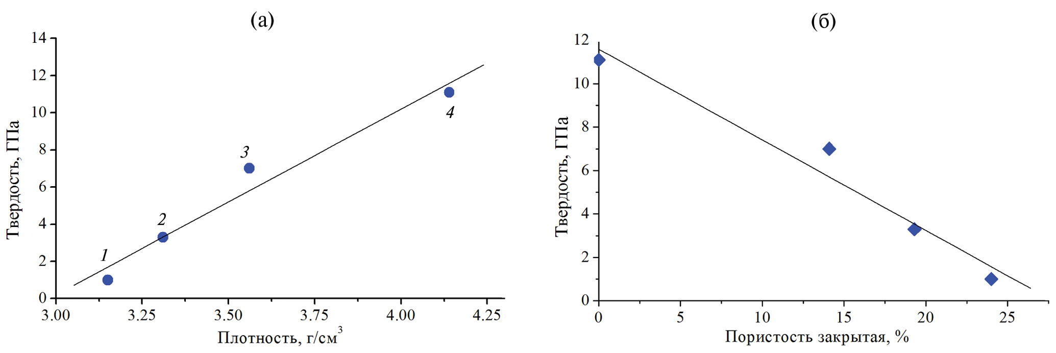 Рис. 3. Зависимости твердости керамических образцов 1–4 после обжига при 1550°С от достигнутой плотности спекания (а) и от закрытой пористости (б)