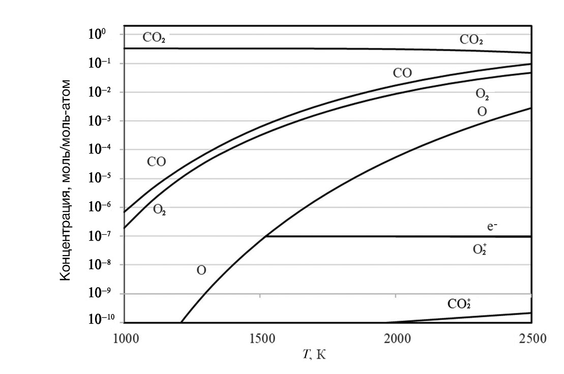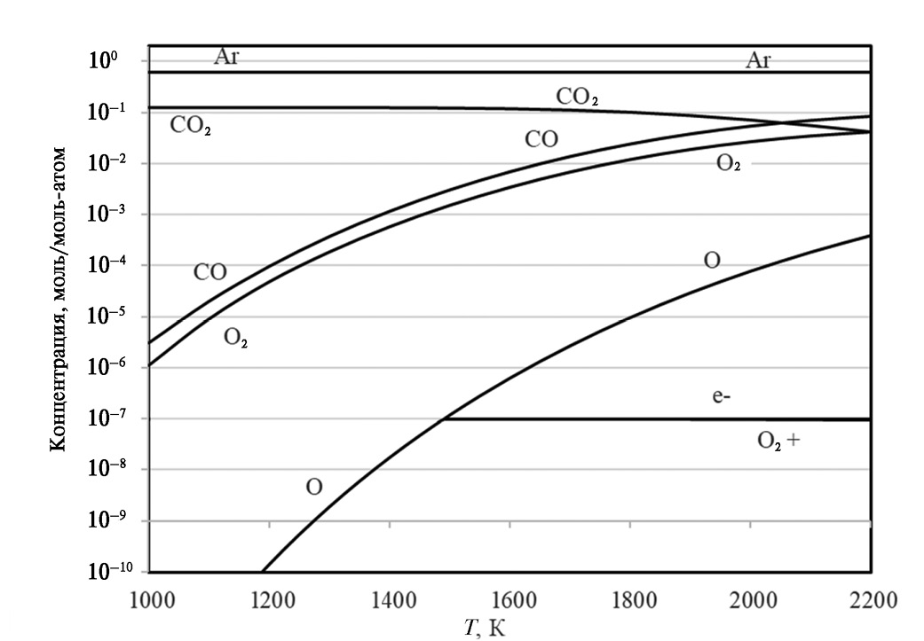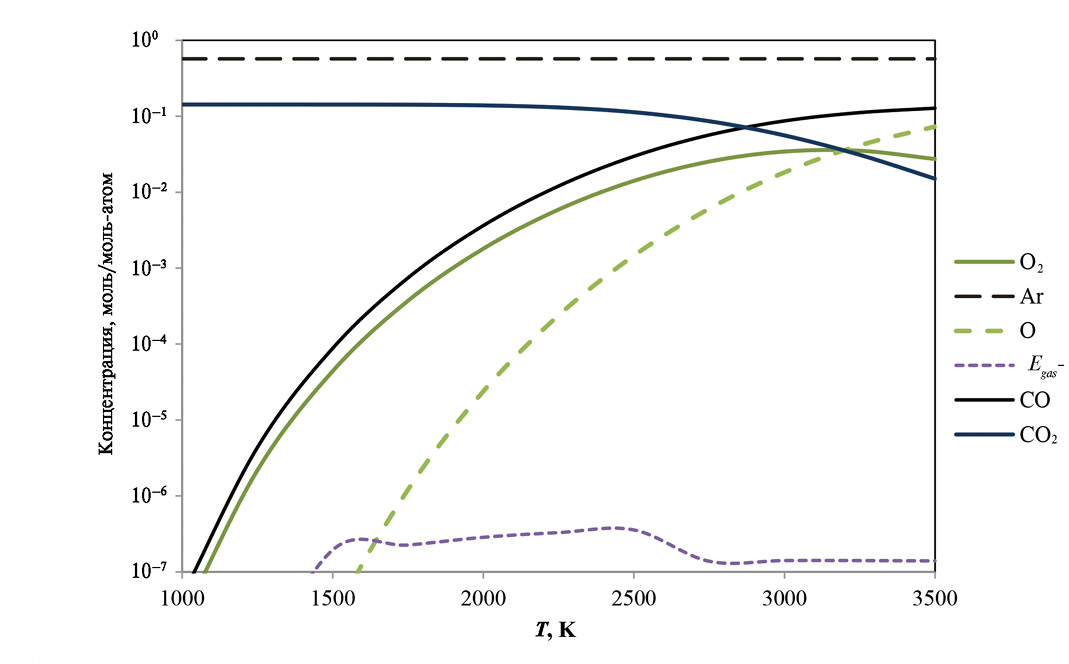 Анализу стационарно-неравновесных плазмохимических состояний предшествовал расчет равновесного состава продуктов термической конверсии CО2 в среде аргона при давлении P = 1 атм (рис. 1). Приближающееся к количественному разложение CО2 в условиях термической плазмы достигается при температурах около 3000 К. Заметим, что в число учитываемых компонентов исследуемой НТП входит конденсированный углерод.