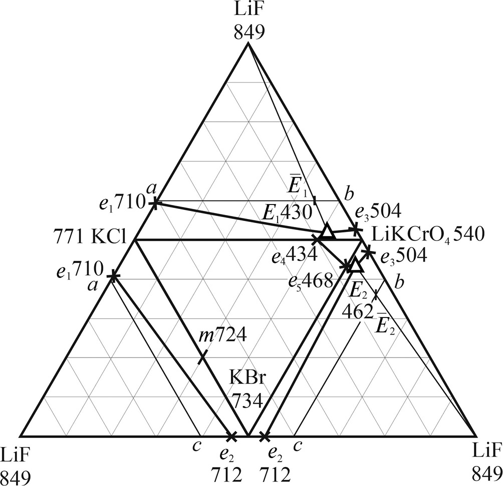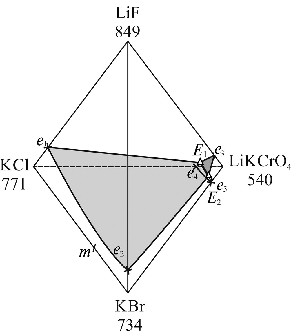 Квазитройная система LiF–KBr–LiKCrO4 – эвтектика E2 при 462°С и составе 3% LiF + 11% KBr + 86% LiKCrO4. Твердые фазы – LiF, KBr и LiKCrO4 [20, 21].