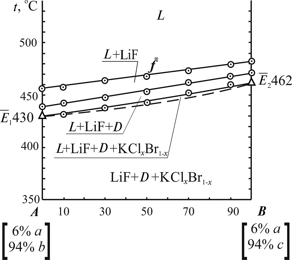 Развертка граневых элементов стабильного тетраэдра LiF–KCl–KBr–LiKCrO4 представлена на рис. 1. Для его экспериментального исследования в объеме кристаллизации фторида лития было выбрано двумерное политермическое сечение abc (a [80%KCl + 20%LiF]; b [80%LiKCrO4 + + 20%LiF]; c [80% KBr + 20% LiF]). Проекция фазового комплекса политермического сечения abc на треугольник составов приведена на рис. 2. В данном сечении для дальнейшего экспериментального исследования был выбран одномерный политермический разрез AB (A [6%a + 94%b]; B [6%a + 94%c]). t–х-диаграмма выбранного разреза приведена на рис. 3. Для дальнейшего экспериментального изучения данного разреза выбран состав, соответствующий центральной точке . Из вершины b политермического сечения abc через выбранную точку с постоянным соотношением a и c был проведен и экспериментально исследован политермический разрез bd (рис. 4). По пересечению ветвей вторичной и третичной кристаллизации были выявлены состав и температура плавления точки , которая является проекцией точки f, лежащей на моновариантной кривой E1E2, на плоскость сечения abс. Исследованием политермического разреза LiFg (рис. 5), проведенного из вершины тетраэдра LiF через точку с постоянным соотношением компонентов KCl и KBr, выявлены координаты точки f – центральной точки, лежащей на моновариантной кривой, соединяющей тройные эвтектики E1E2: температура плавления – 442°С, состав – 10% LiF, 81.9% LiKCrO4, 4.1% KCl, 4.1% KBr.