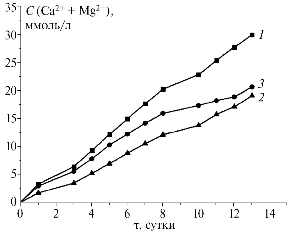 Коэффициент накопления ионов на поверхности рассчитывали по формуле , где ΔC (Ca2+ + Mg2+) – общее изменение концентрации в течение временного интервала τ (в днях) [19].