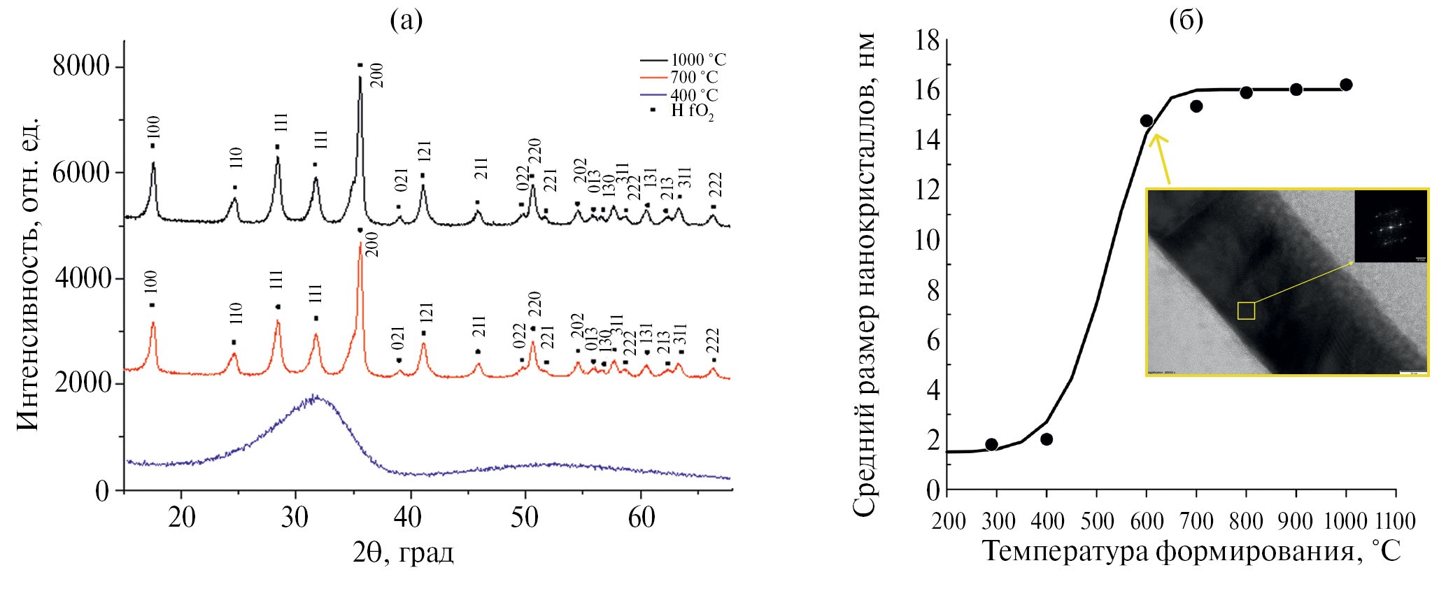 Рис. 1. Дифрактограммы образцов оксида гафния после термической обработки при 400, 700, 1000 °С (а) и средний размер кристаллитов, образующих пленку, вычисленный по формуле (1) (точки), аппроксимация по формуле (5) (б)