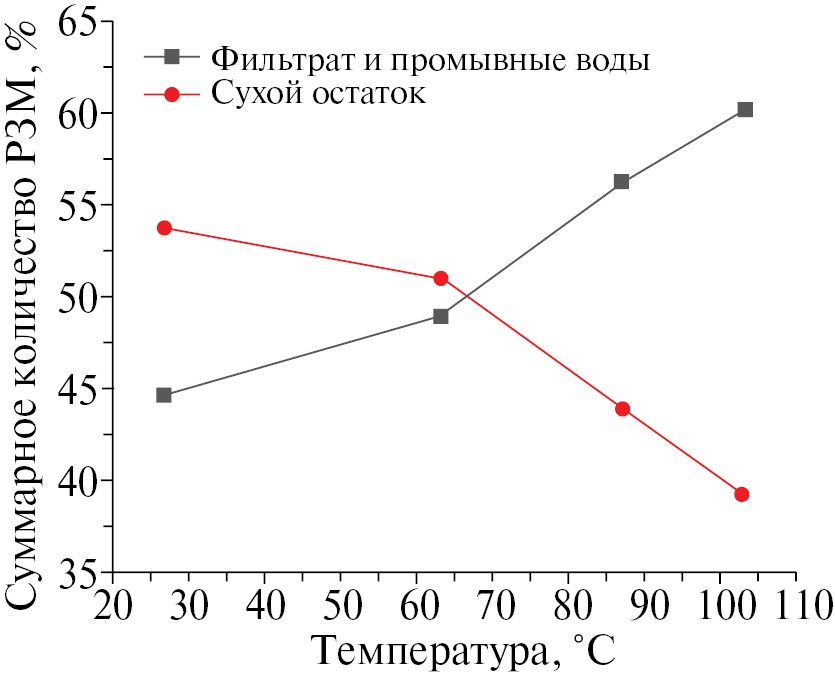 Рис. 5. Температурные зависимости общего содержания РЗМ в фильтрате и промывных водах, а также в сухом остатке после обработки фосфогипса 2 М раствором азотной кислоты