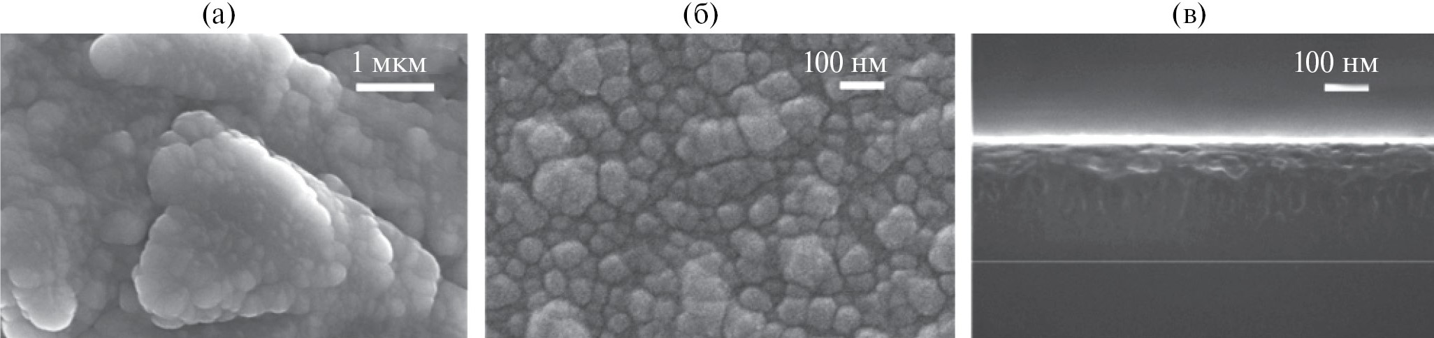 Рис. 4. СЭМ-изображения пленки TiSiN, полученной при содержании азота в исходной газовой смеси 50%, на подложках различной шероховатости: 300 (а), 10 нм (б), а также скол образца (в).