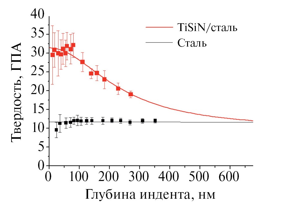 Рис. 5. Результаты наноиндентирования пленки TiSiN, полученной при содержании азота в исходной газовой смеси 50%, а также подложки стали ШХ-15.