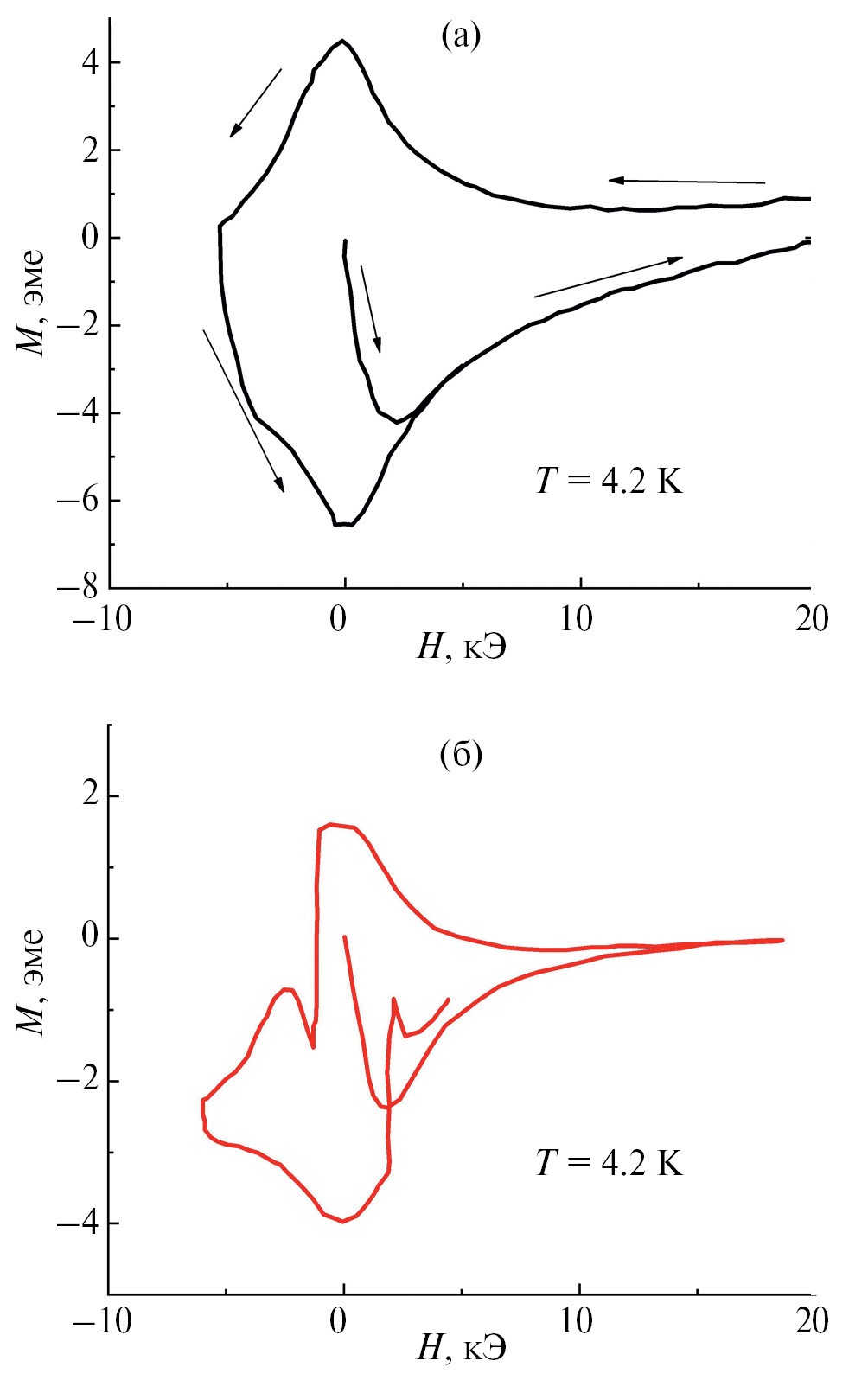 Рис. 3. Фрагменты зависимостей магнитного момента от поля при 4.2 К для YRh₄B₄ (а) и Y₀.₈Dy₀.₂Rh₄B₄(б).