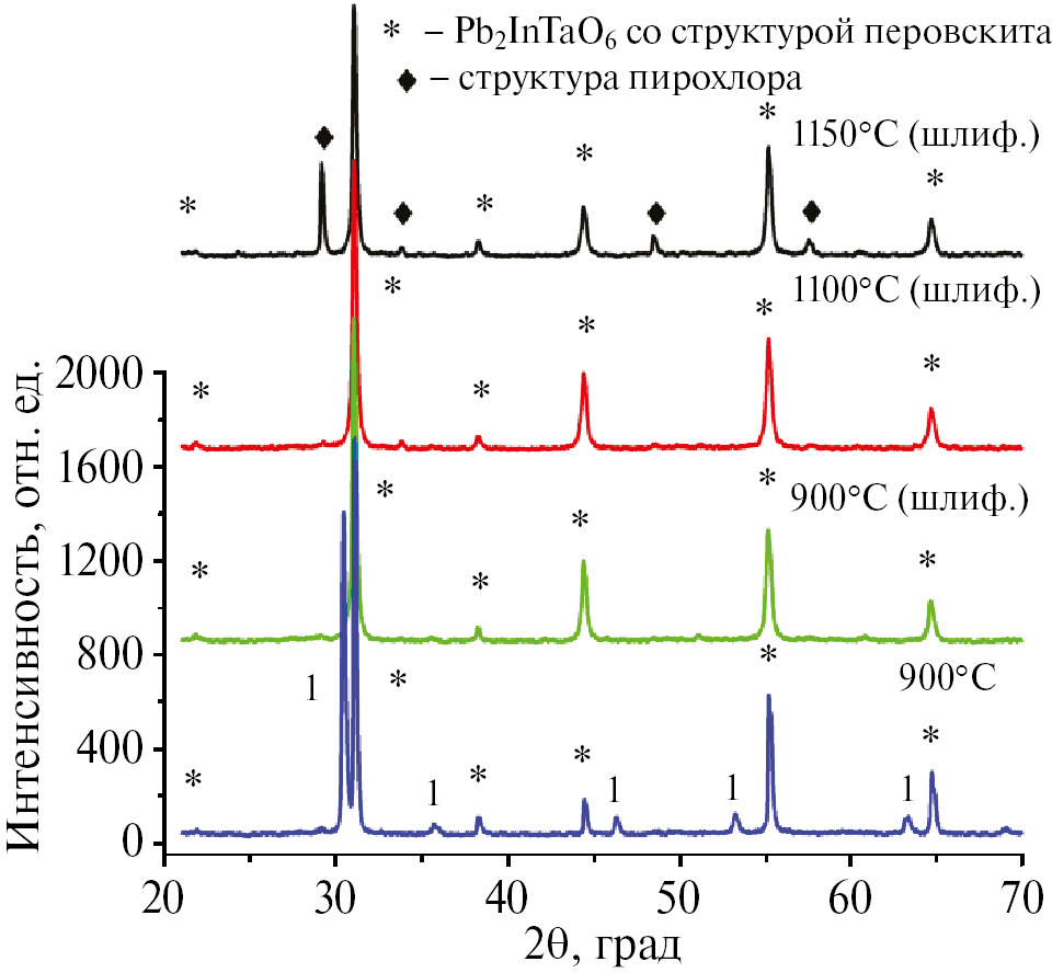 1 мас.% Li2CO3 сверх стехиометрии, время обжига 1 ч. При спекании образцов до 800°С формируется двухфазная система перовскит–пирохлор с преобладанием пирохлорной фазы. В случае обжига при 900°С, как следует из рис. 3, формируется преимущественно фаза перовскита с небольшим количеством фазы пирохлора. После шлифования образца появляется заметное количество фазы пирохлора. После обжига в интервале температур от 950 до 1050°С формируется только фаза перовскита, однако после шлифовки появляется фаза пирохлора, при этом чем при больших температурах обжигаются образцы, тем больше фазы пирохлора в них присутствует. При повышении температуры до 1100°С на нешлифованном образце появляется фаза пирохлора, а на шлифованном она преобладает. При обжиге при 1150°С наблюдается только фаза пирохлора с небольшим количеством оксида свинца Pb3O4 (фазы 2).