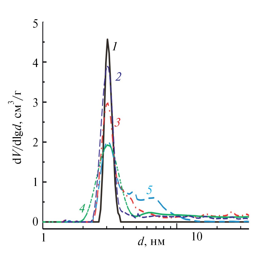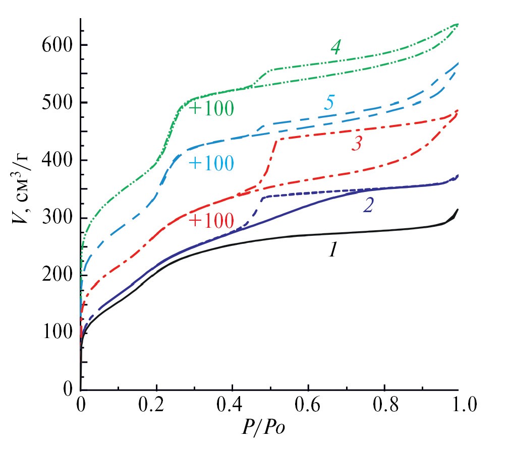 На рис. 1 представлены изотермы адсорбции азота при 77 К для синтезированных частиц. Все изотермы имеют точку перегиба при p/p0 ≈ 0.3 (тип IV [17]), обусловленную капиллярной конденсацией азота в мезопорах размером 3 нм. Наличие гистерезиса в области 0.4<p/p0<0.99 (рис.1, кривые 2–5) связано с капиллярной конденсацией азота в мезопорах размером от 4 до 50 нм («крупных» мезопорах).