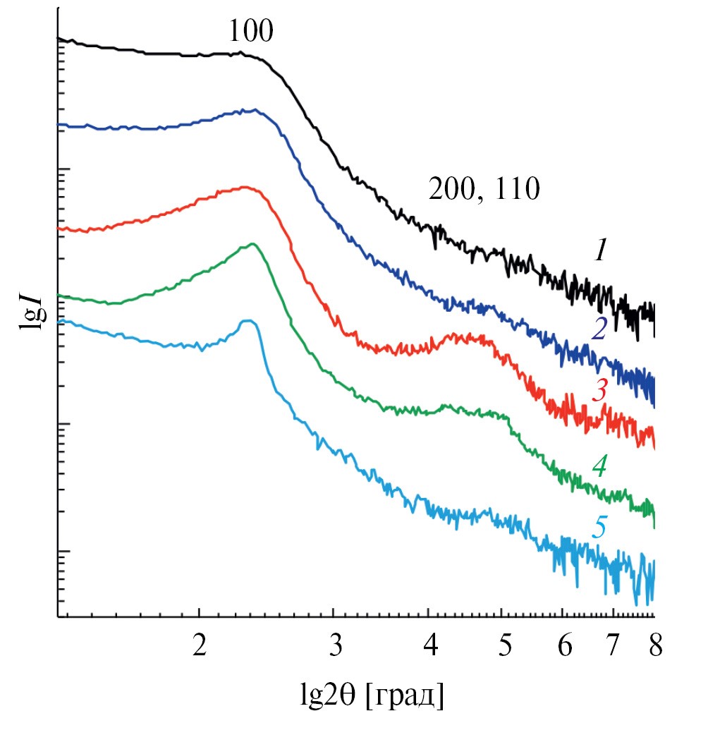 Рис. 3. Дифракционные кривые для синтезированных частиц кремнезема, 1–5 – см. подпись к рис.1 (обозначены индексы Миллера наблюдаемых дифракционных рефлексов; для удобства кривые сдвинуты вдоль оси ординат).
