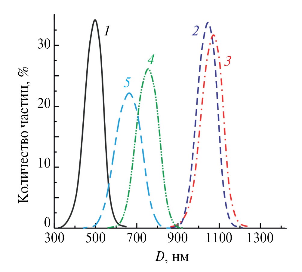 Рис. 4. Распределение гидродинамических диаметров частиц кремнезема, измеренное методом ДСР, 1–5 – см. подпись к рис.1.