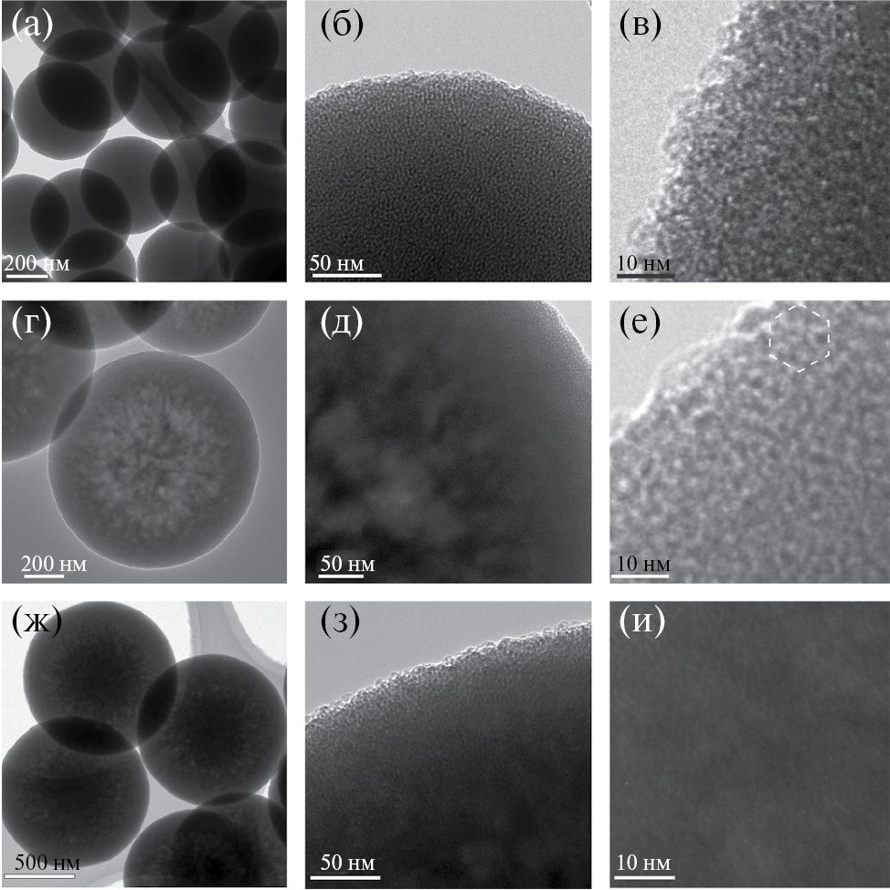 Рис. 5. ПЭМ-изображения частиц кремнезема, синтезированных при 50 (а–в), 30 (г–е), 10°C (ж–и) (белым шестиугольником обозначен кластер плотноупакованных наноканалов кремнезема).