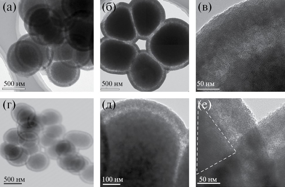 На дифрактограммах (рис. 3, кривые 4, 5) частиц, синтезированных при 0 и –20°С, наблюдается дальнейшее сужение пика 100 по сравнению с дифрактограммами частиц, синтезированных при более высоких температурах. Это свидетельствует о наибольшем размере кластеров (размере ОКР) в данных частицах, что коррелирует с данными ПЭМ (рис. 6). Вторая полоса в области 4°<2q<6° также наблюдается на дифракционных кривых, но ее интенсивность ниже для частиц, синтезированных при ‒20°С, что, вероятно, обусловлено дефектностью крупных кластеров в них. Так, на ПЭМ изображениях частиц видно (рис. 6г–6е), что наноканалы преимущественно ориентированы от центра частицы к ее внешней поверхности.
