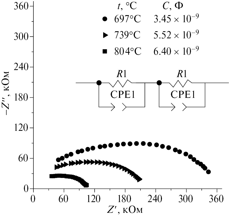 Рис. 5. Годографы импеданса композита состава 0.97СaWO4–0.03Al2O3, полученные при различных температурах, с эквивалентной схемой.