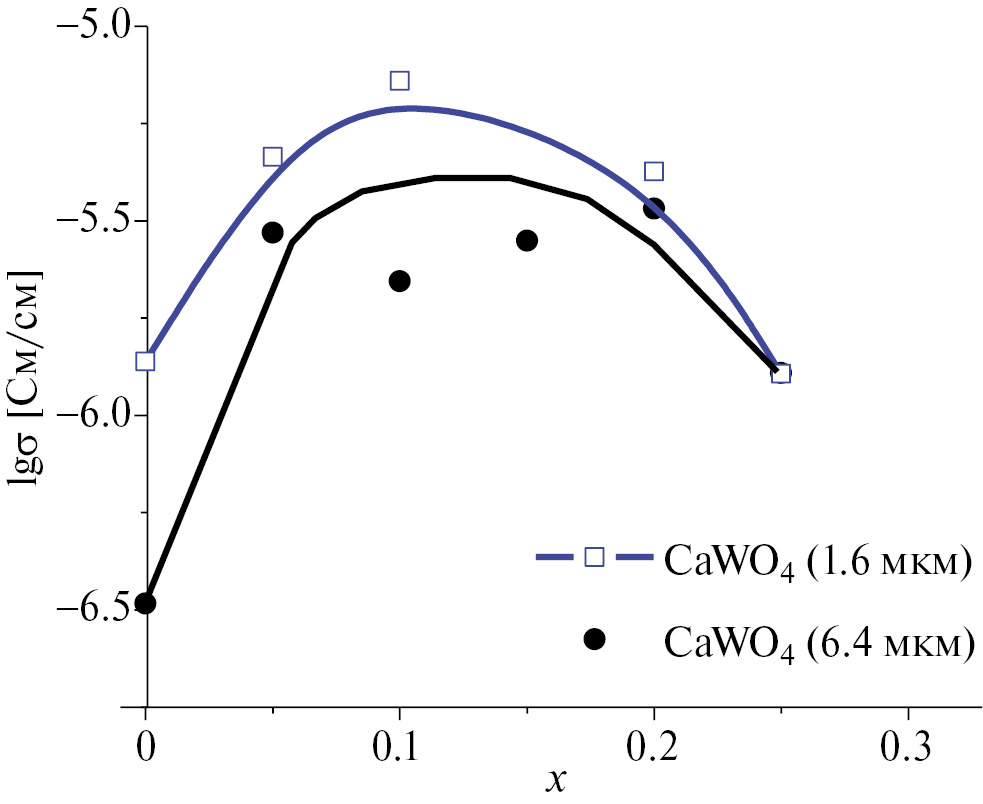 Концентрационные зависимости проводимости композитов (1-x)СaWO4–xAl2O3 с разным размером зерен вольфрамата кальция представлены на рис. 8.