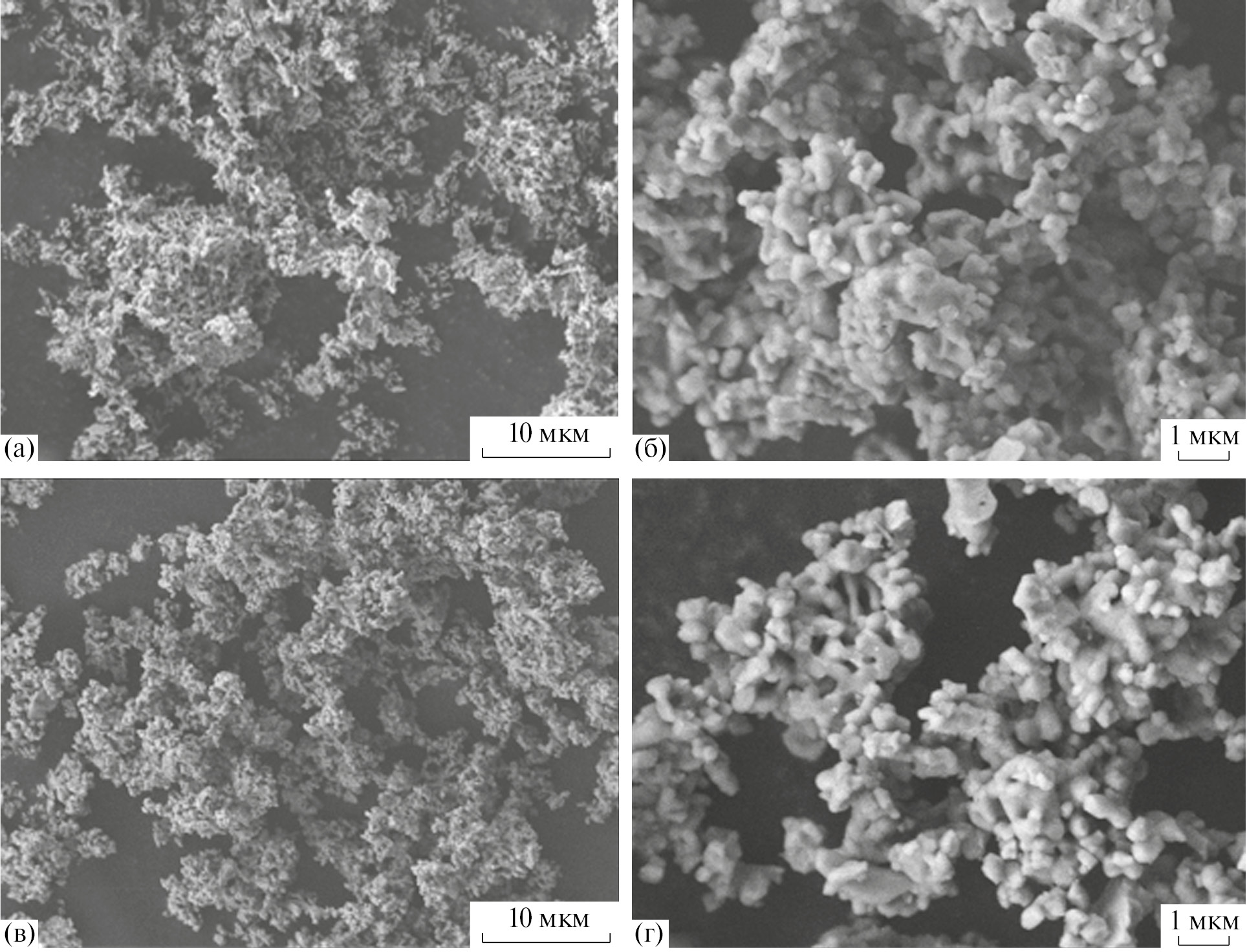 На рис. 5а и 5б приведены микрофотографии ГА при увеличении в 2500 и 10000 раз соответственно. Синтезированный образец представляет собой агломераты микрометрового размера, состоящие из более мелких частиц размером 300-500 нм. Анализируя структуру образца ZnГА при увеличении в 2500 и 10000 раз (рис. 5в, 5г), можно сделать вывод, что агломераты образца состоят из спеченных частиц сферической формы с размером 200–400 нм.