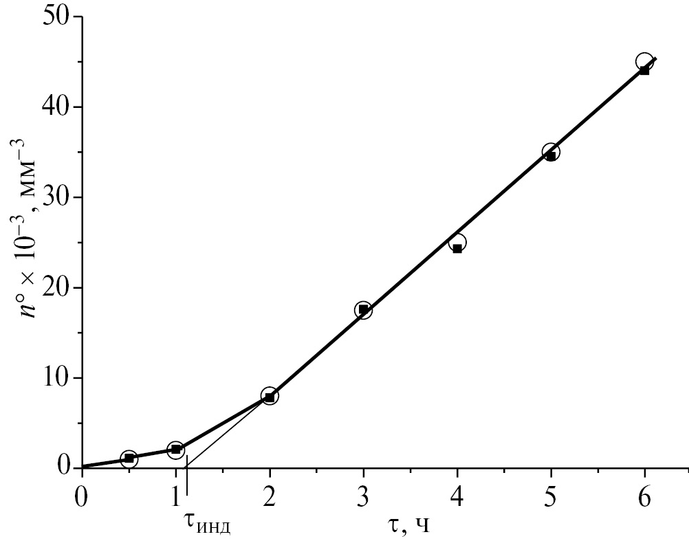 Гомогенное зарождение кристаллов. В отсутствие фоточувствительных примесей в стекле дисиликата лития реализуется гомогенное зарождение кристаллов, как и в стекле этого состава с фоточувствительными примесями без облучения, в стекле с примесью серебра без церия при УФ-облучении, а также в стекле с церием при рентгеновском облучении [32]. Главными характеристиками образования кристаллов в стеклах в условиях гомогенного и гетерогенного зарождения являются скорость стационарного зарождения Iст=dn/dτ на линейном участке зависимости n(τ) и его индукционный период τинд, равный отрезку, отсекаемому на оси времени продолжением линейного участка зависимости n(τ).