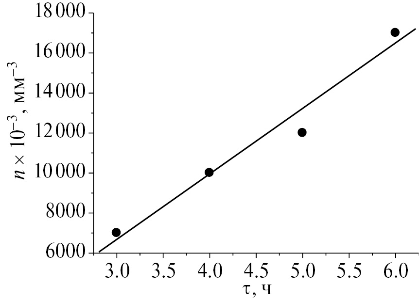 Рис. 3. Зависимость от времени числа кристаллов, гетерогенно зародившихся при температуре 460°С в стекле 2.