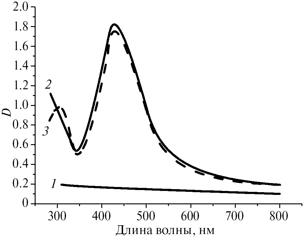 Рис. 4. Зависимости оптической плотности образцов от длины волны после зарождения кристаллов в течение 3 ч при 460°С: 1 – исходное стекло 1 без примесей; 2 и 3 – предварительно облученные рентгеновским излучением в течение 10 мин стекло 2 с примесью Ag и стекло 4 с примесью CeO2 + Ag соответственно.