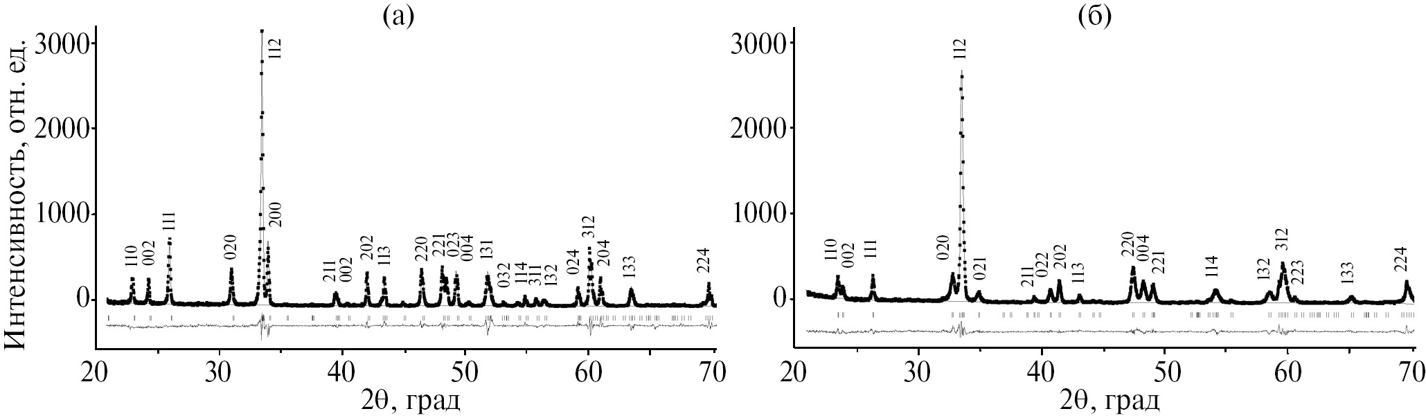 Рис. 1. Дифрактограммы манганитов EuMnO3 (а) и Eu0.75Sr0.25MnO3 (б).