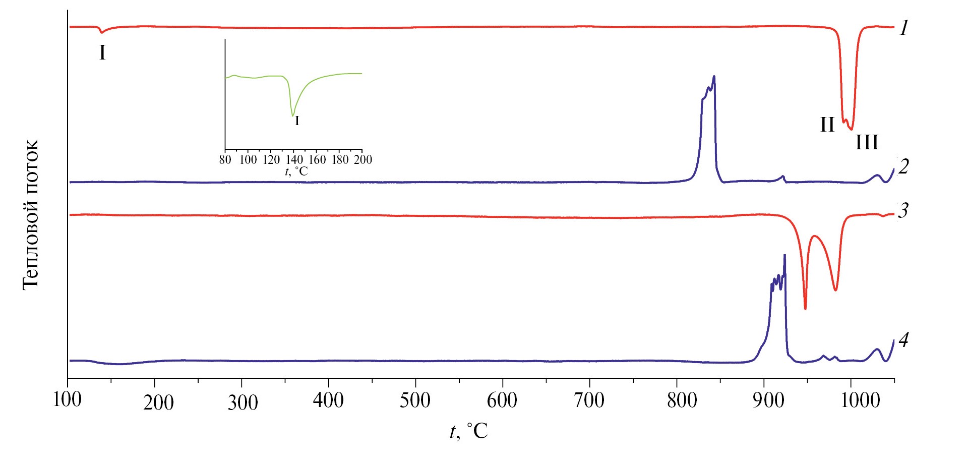 Рис. 2. Кривые ДСК синтезированного продукта α-Zn₂P₂O₇, полученные при циклировании нагрев–охлаждение в интервале 25–1100°C: 1 – первый нагрев, 2 – первое охлаждение, 3 – второй нагрев, 4 – второе охлаждение;. I – полиморфный переход α → β; II – инконгруэнтное плавление Zn₂P₂O₇; III – ликвидус.
