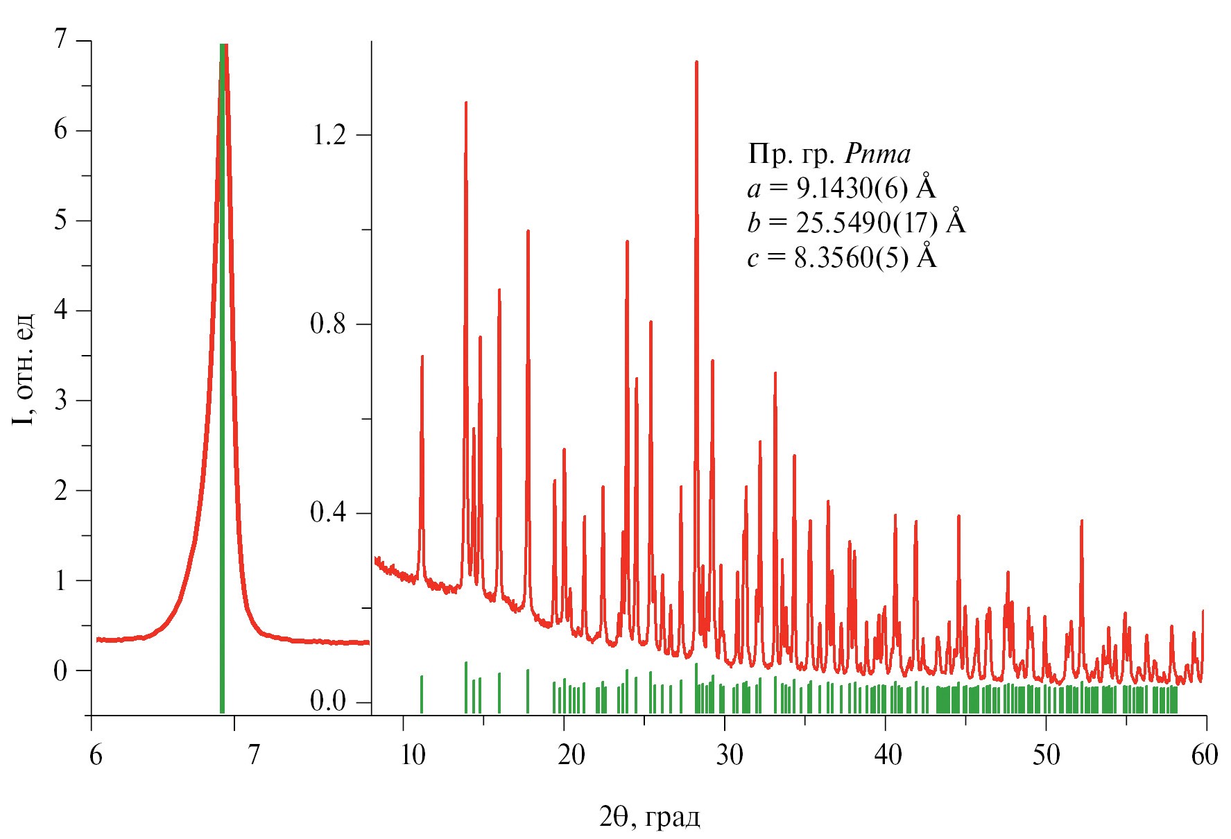 Рис. 6. Рентгенограмма α-Zn₂P₂O₇, полученного после отжига Zn₂P₂O₇∙5H₂O при 700°C (структурная модель α-Zn₂P₂O₇ взята из статьи [16]).
