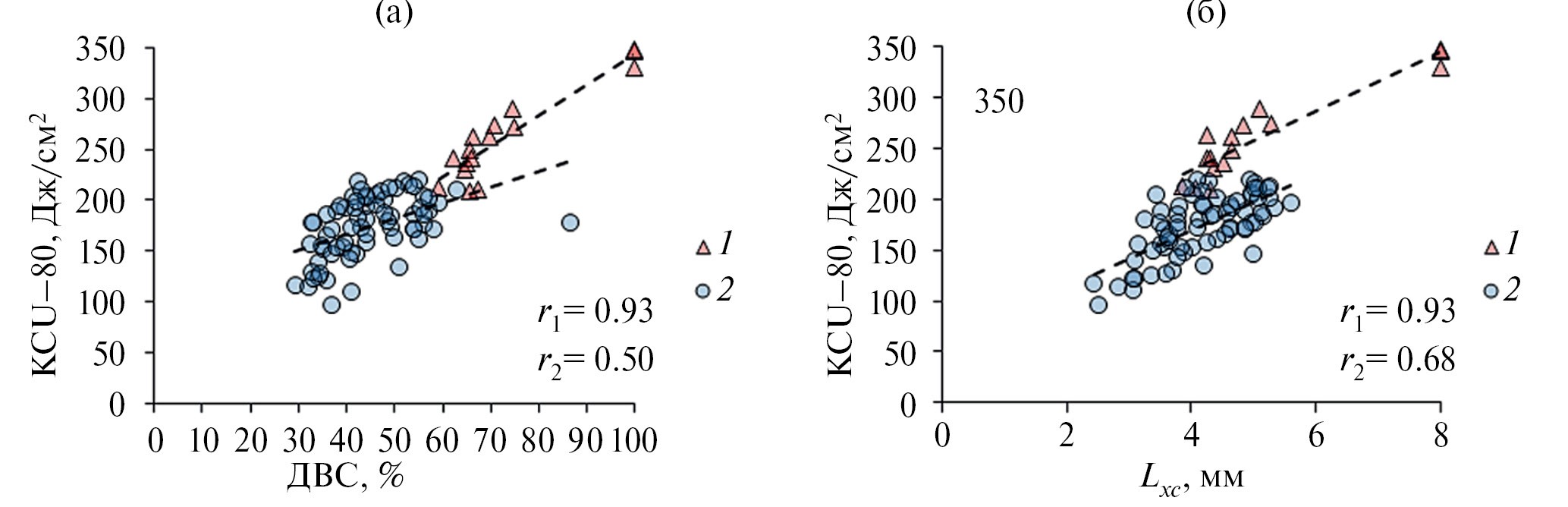 Рис. 5. Количественная оценка характеристик изломов: соотношение ДВС и KCU–80 (а), соотношение Lхс и KCU–80 (б).