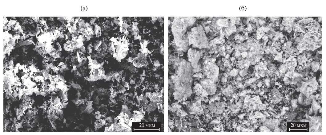 Для синтезированных шпинелей, согласно данным РЭМ, характерна высокопористая микроструктура с развитой поверхностью (рис 2). Образование развитой пористой структуры связано с обильным выделением газообразных продуктов (прежде всего СO, CO2) в ходе окислительно-восстановительного процесса горения, что свойственно нанопорошкам, получаемым методом цитратного горения. Поверхность феррита никеля имеет “кораллоподобную” структуру, вытянутые кристаллиты проявляют ярко выраженную агломерацию (рис. 2а). На микрофотографии феррита цинка (рис. 2б) видно, что он образует достаточно крупные агрегаты пластинчатых кристаллитов.