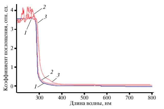 Рис. 1. УФ-ВИД-спектры поглощения ПММА (1) и композитов ПММА/Pb(CF3COO)2, содержащих соль свинца (ионы свинца) в исходном растворе в концентрации: Ссоль Pb = 5.0 мас.% (СPb = 2.4 мас.%) (2) и Ссоль Pb = 83 мас.% (СPb = 40 мас.%) (3).