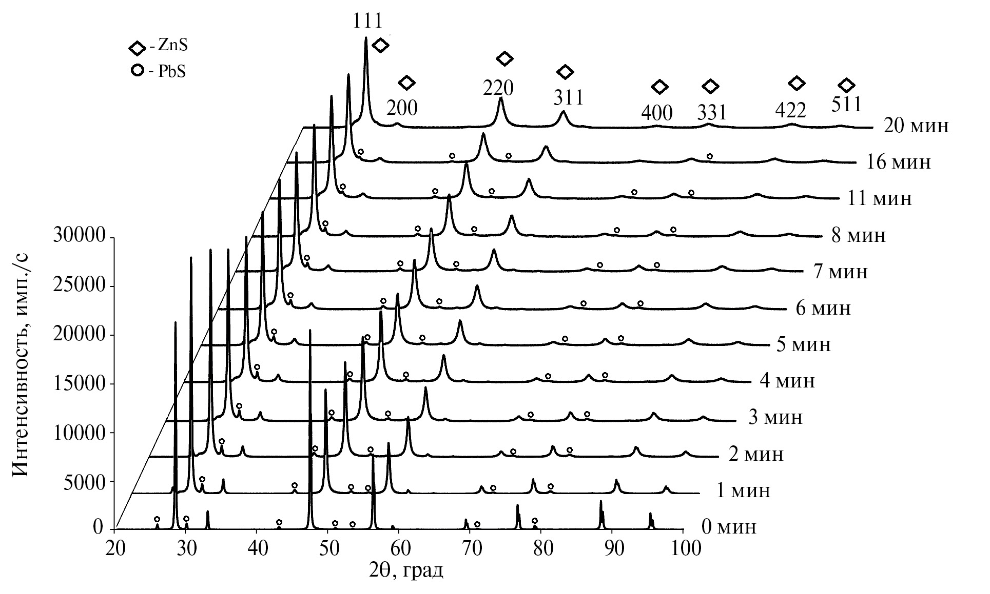 По результатам РФА (рис. 1), исходный образец преимущественно представлен сфалеритом (кубическая сингония, пр. гр. F-43m). Ранее было установлено [20], что исследуемый сфалерит имеет состав Zn0.96Fe0.04S. Наблюдаемые дифракционные линии малой интенсивности относятся к PbS, его содержание мало и связано с трудностью разделения составляющих минерала.
