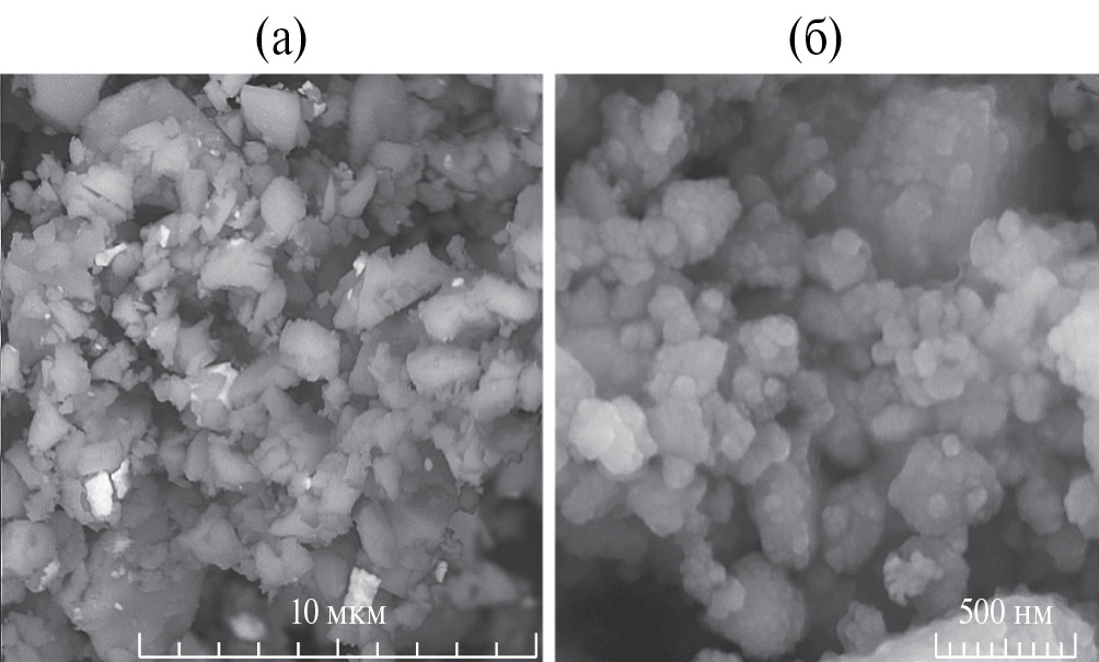 Согласно данным электронной микроскопии (рис. 2), исходный измельченный в агатовой ступке образец сфалерита, не подвергнутый механоактивации, является полидисперсным, размер его частиц составляет менее 15 мкм. Механоактивация сфалерита в течение 1 мин (рис. 3а) значительно уменьшает (до 1–3 мкм) размер частиц, форма которых становится более округлой. Увеличение продолжительности механоактивации до 16 мин приводит к еще большему измельчению частиц, размер которых колеблется в пределах 46–115 нм, а средний размер в поле зрения микроскопа составляет 79 нм (рис. 3б). В целом механоактивация приводит к диспергированию сфалерита и образованию агломератов различных размеров. Согласно элементному анализу, состав некоторых частиц механоактивированного сфалерита близок к формуле Zn1.08Fe0.07S, тогда как исходный минерал отвечал формуле Zn0.96Fe0.04S [20], что указывает на возможное выделение серы из образца в результате его измельчения. Уменьшение соотношения Zn/Fe в активированном сфалерите, по-видимому, объясняется частичным образованием сульфатов цинка на его поверхности. Подобное изменение соотношения Zn и Fe выявлено при механоактивации сфалерита авторами [10].
