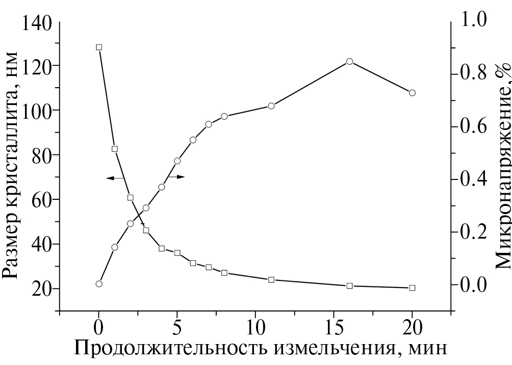 Рис. 4. Изменение размера кристаллитов и микронапряжений в процессе механоактивации сфалерита.